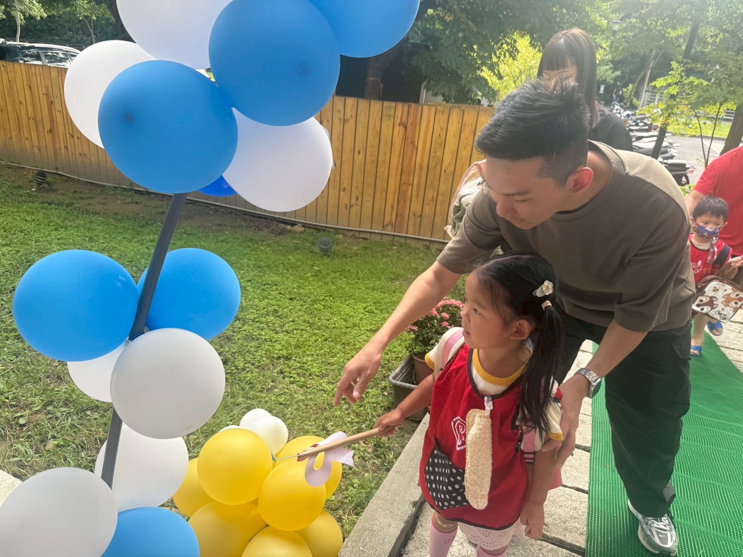 感受開學的氣氛,迎接新學期的生活,將氣球戳破,象徵成長禮炮,代表孩子長大了
