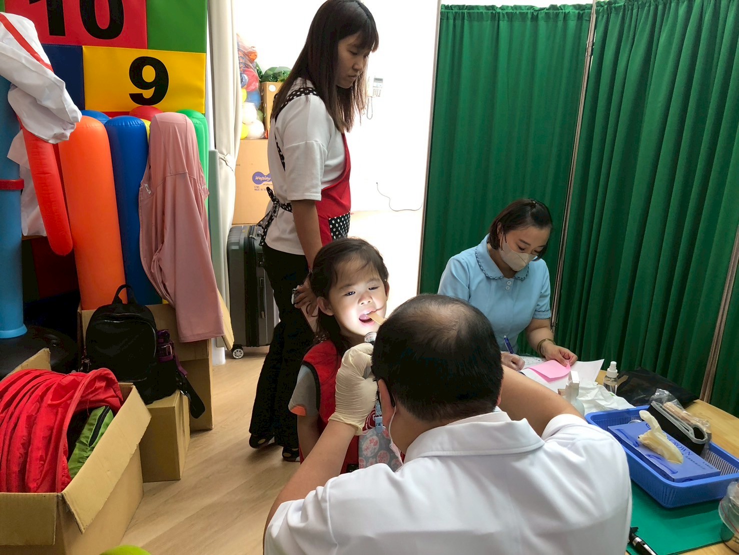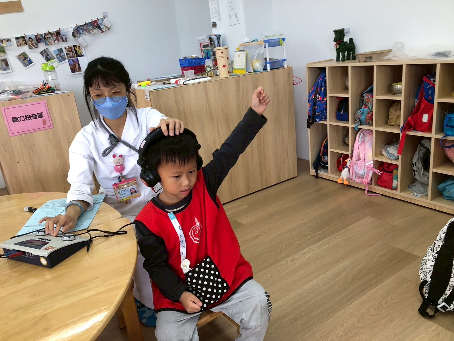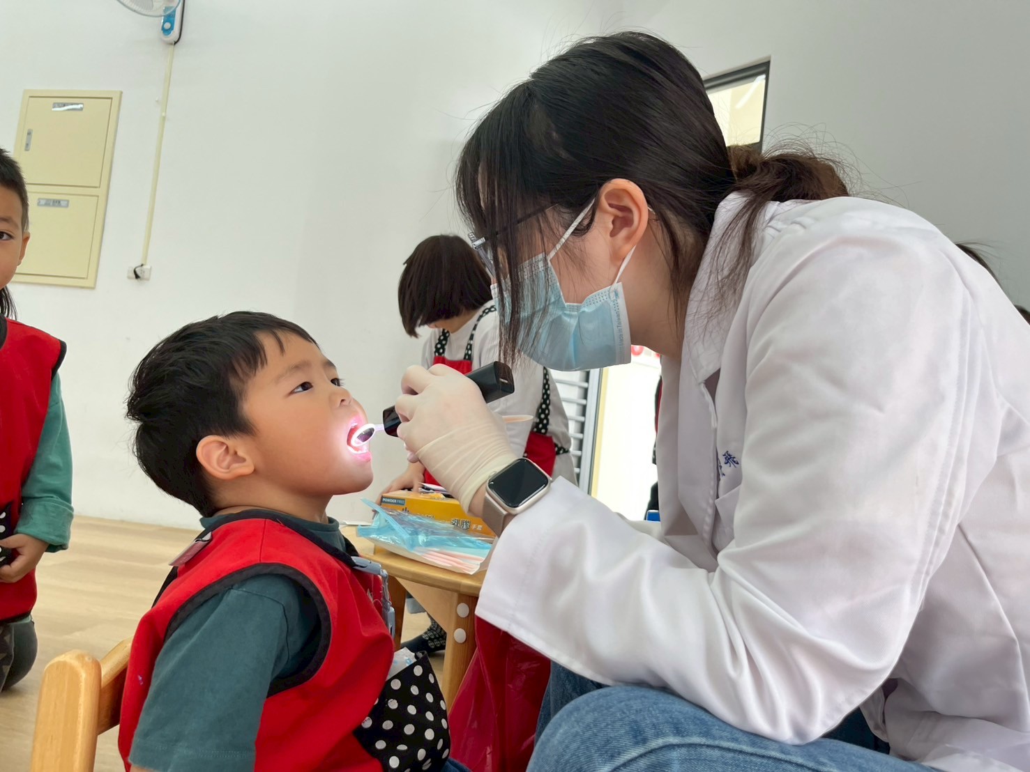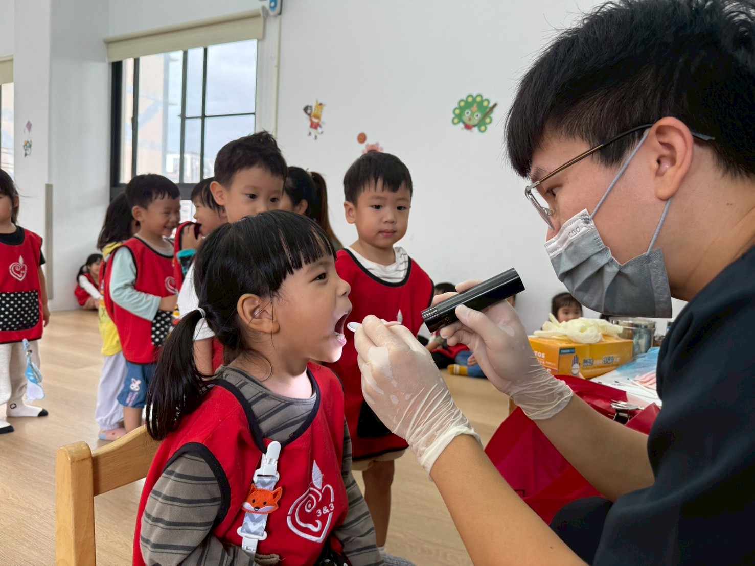 醫護人員細心地為孩子們測量身高、體重,確認視力與聽力,並進行基本健康評估,確保每位孩子都能健康地。