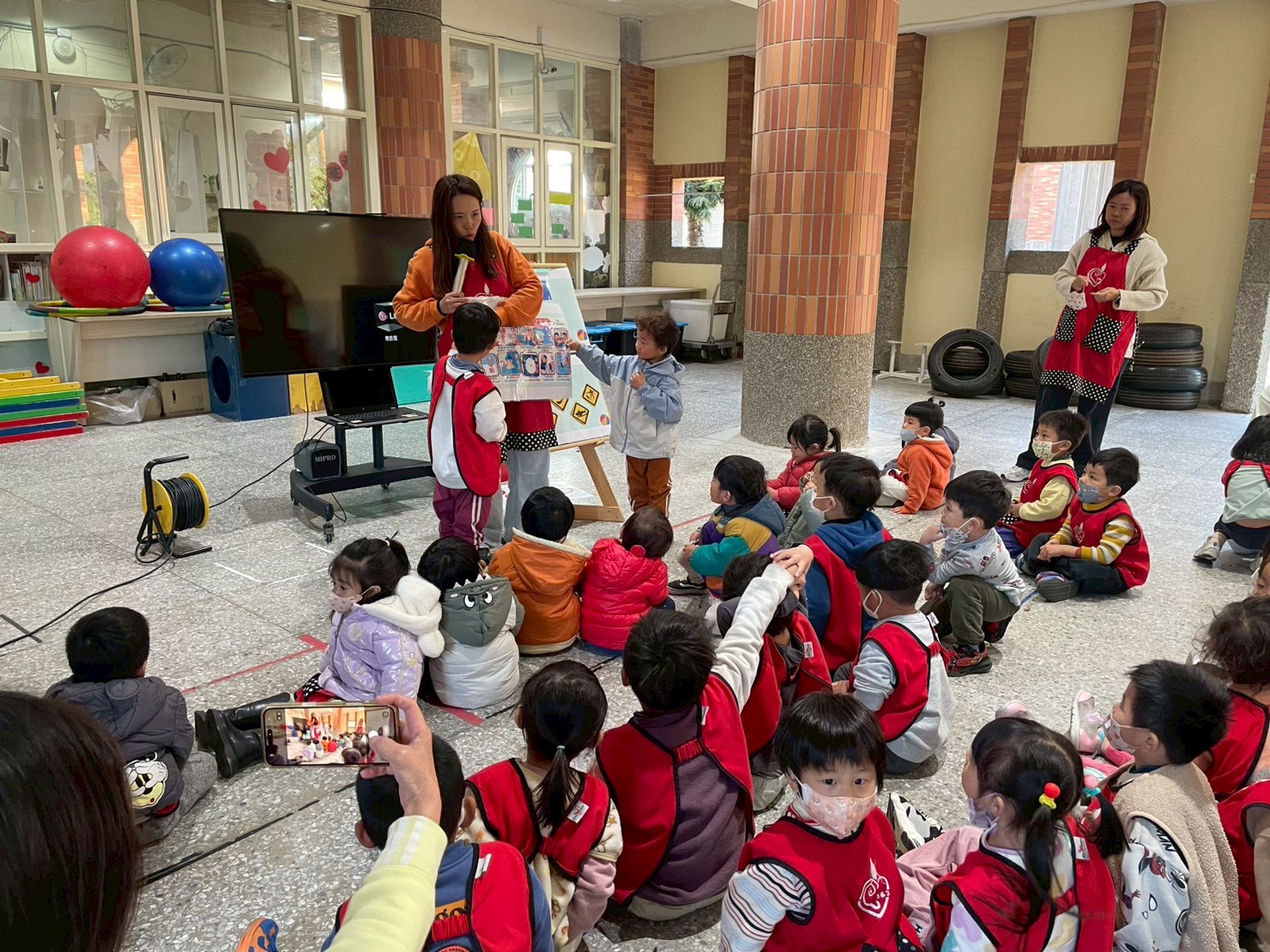 老師透過影片引導幼兒認識紅綠燈,過馬路時要牽著大人的手並左右觀看來車,確保過馬路的安全。