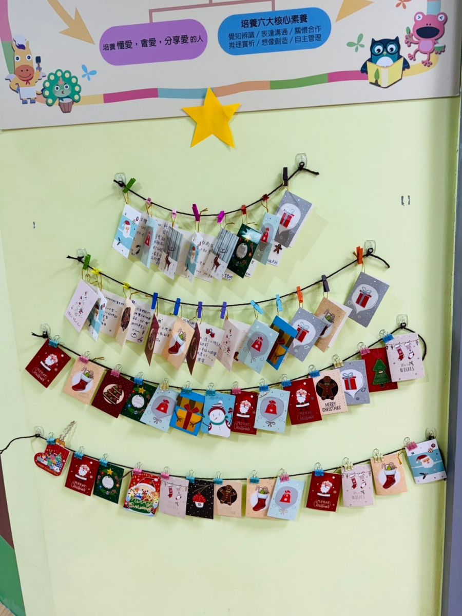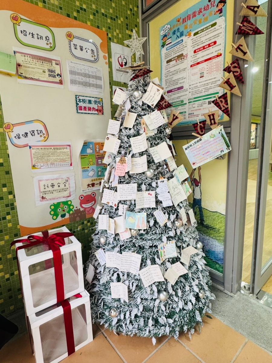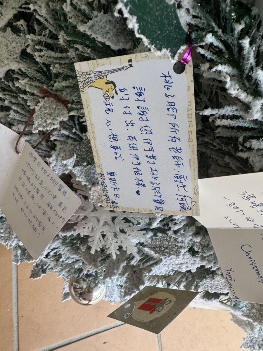 桃子腳幼兒園的第一棵聖誕樹上掛上了滿滿的祝福卡片,