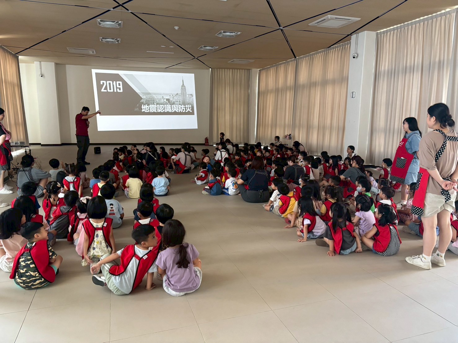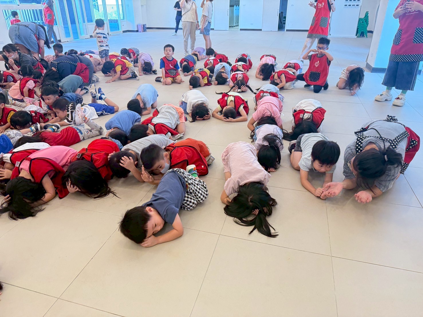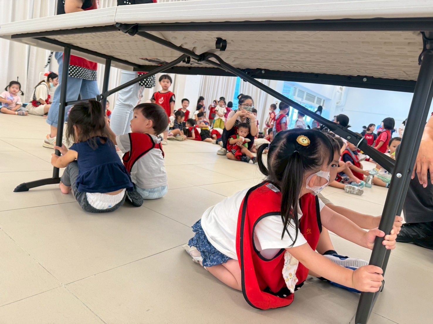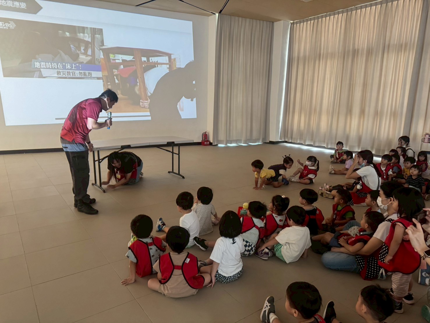 透過消防員叔叔的地震防災演練讓幼童更加理解面對災害時的應對措施和重要性。