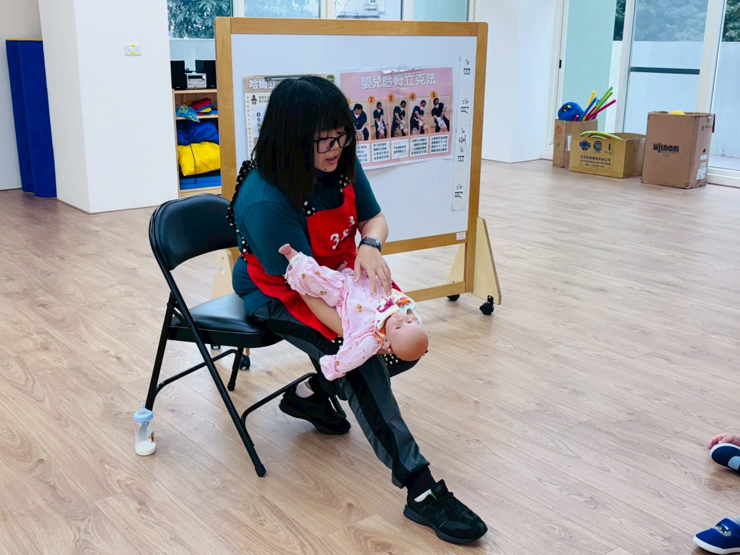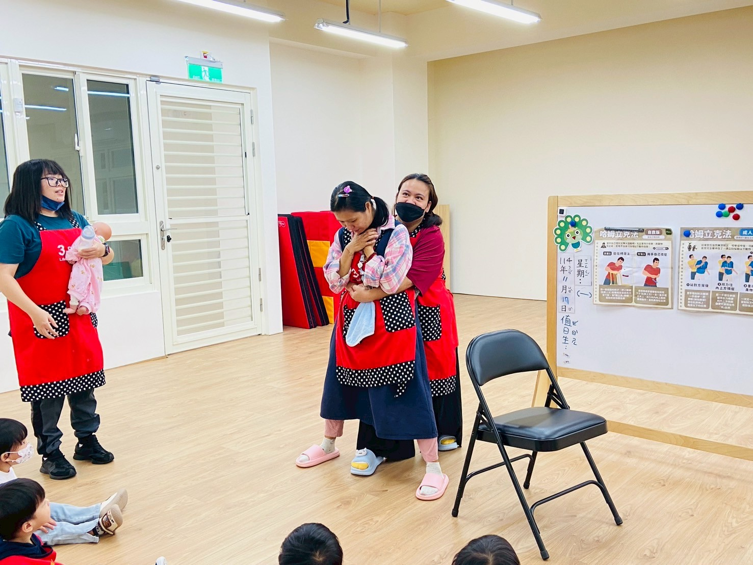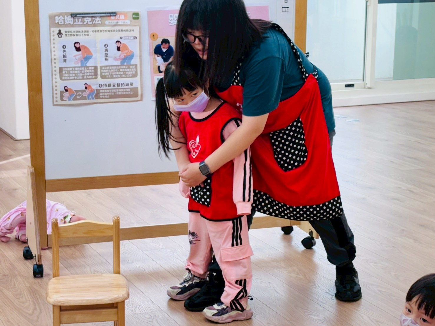 學習如何預防異物梗塞,讓幼兒們知道該怎麼保護自己,老師們也親自示範急救方法,讓安全知識變成超級技能
