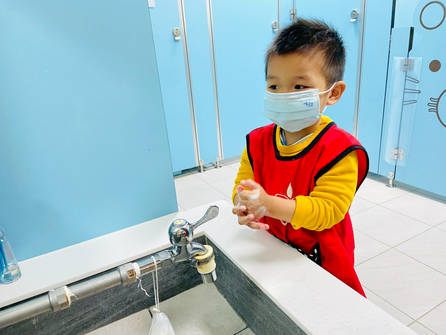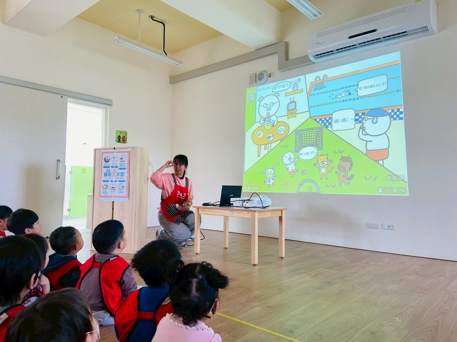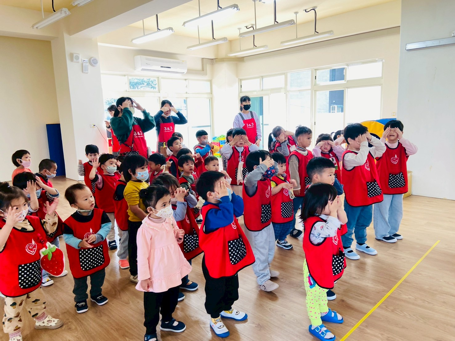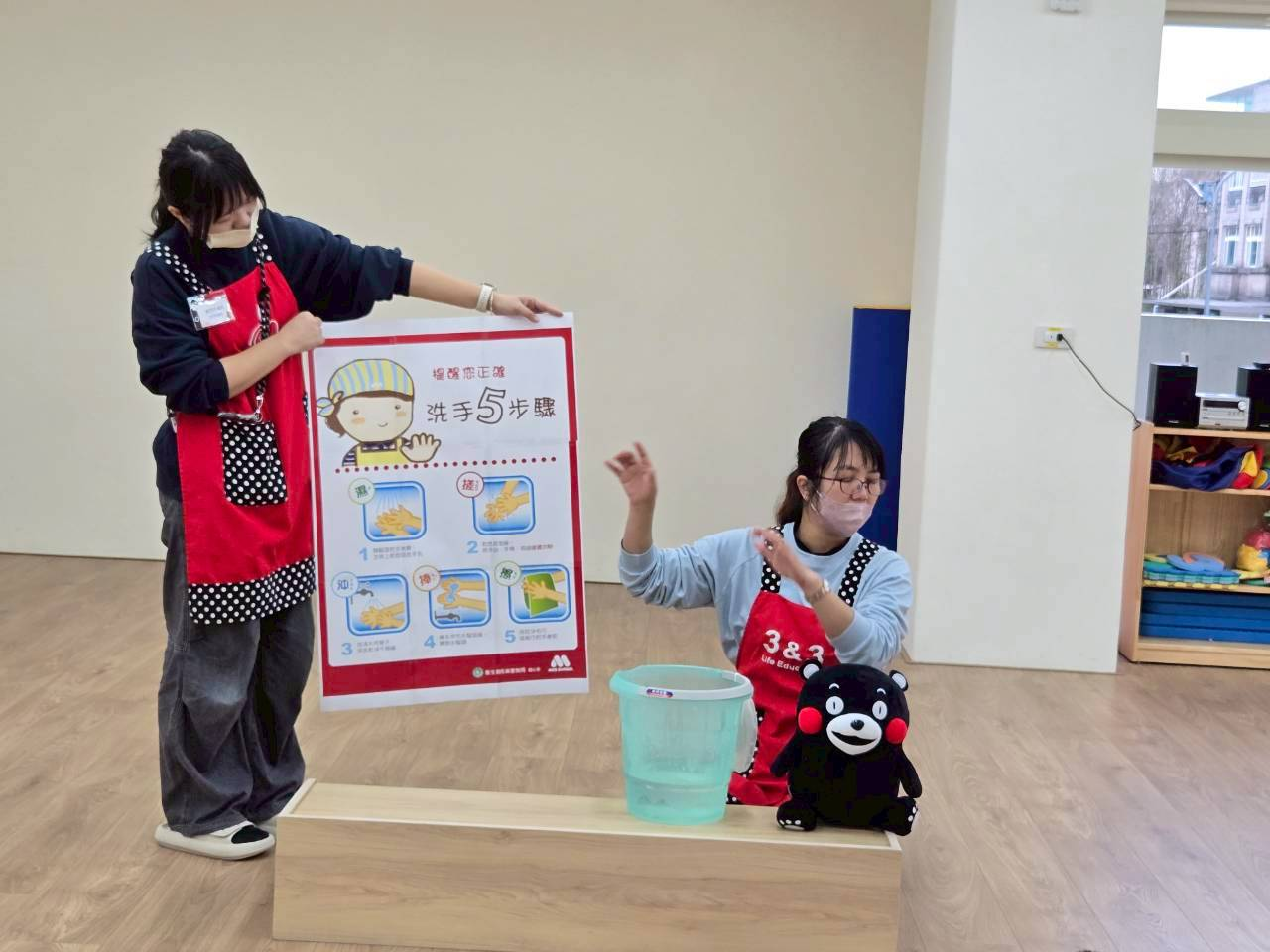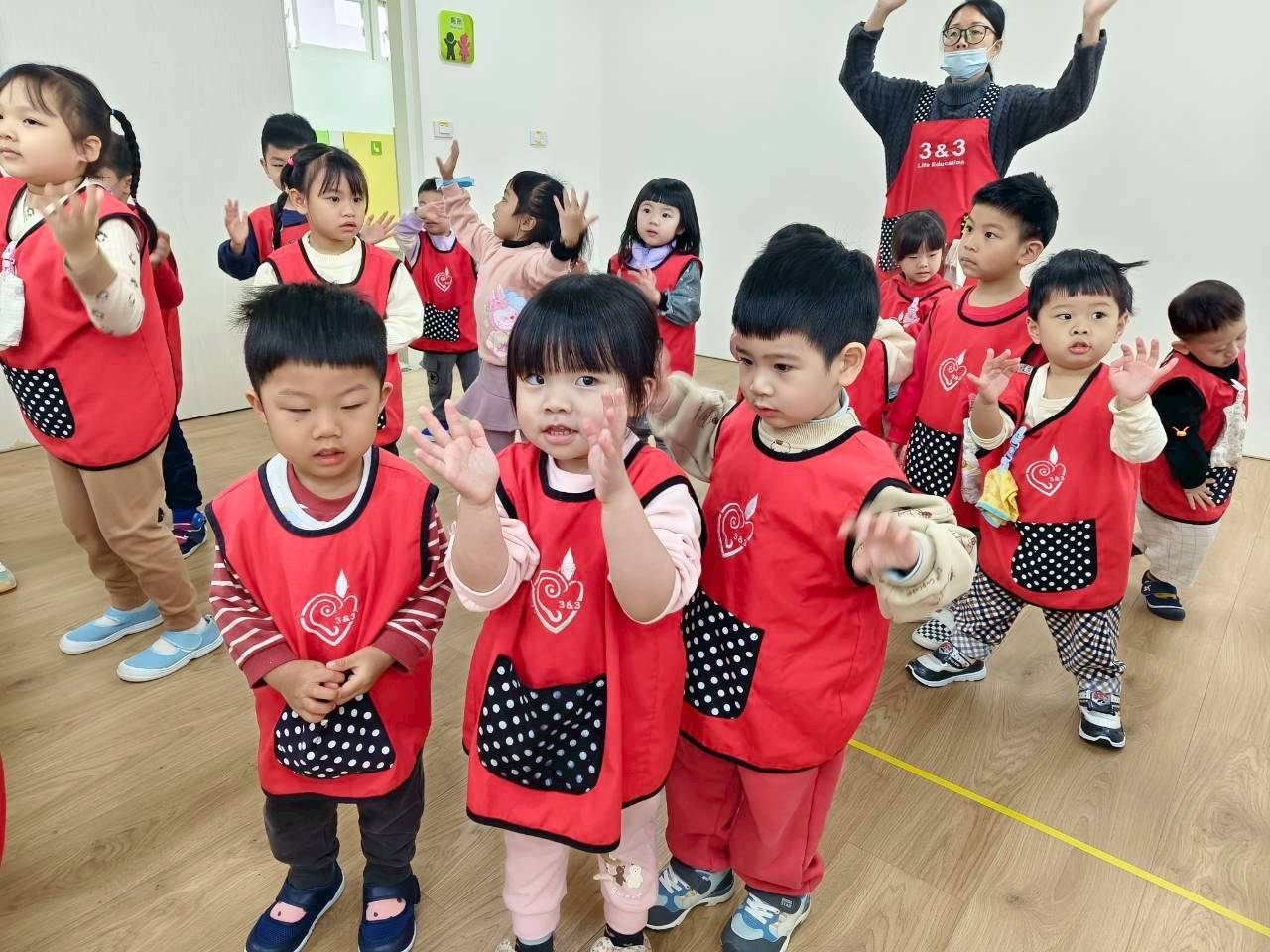 老師帶領孩子實際操作洗手五步驟:「濕、搓、沖、捧、擦」及七字訣:「內、外、夾、弓、大、立、腕」,並搭配律動音樂跳洗手步驟。孩子們一邊做動作、一邊練習正確洗手方式,在愉快的氛圍中加深印象,也養成日常防疫好習慣,一起守護健康!