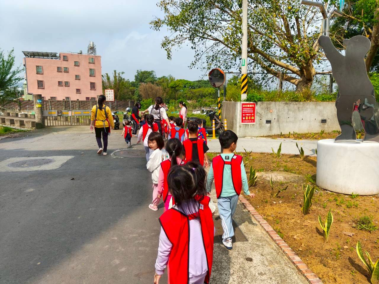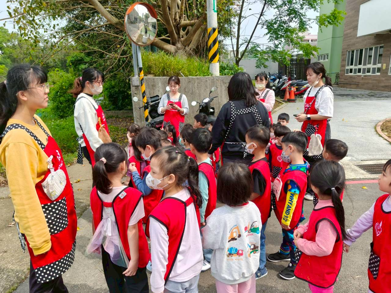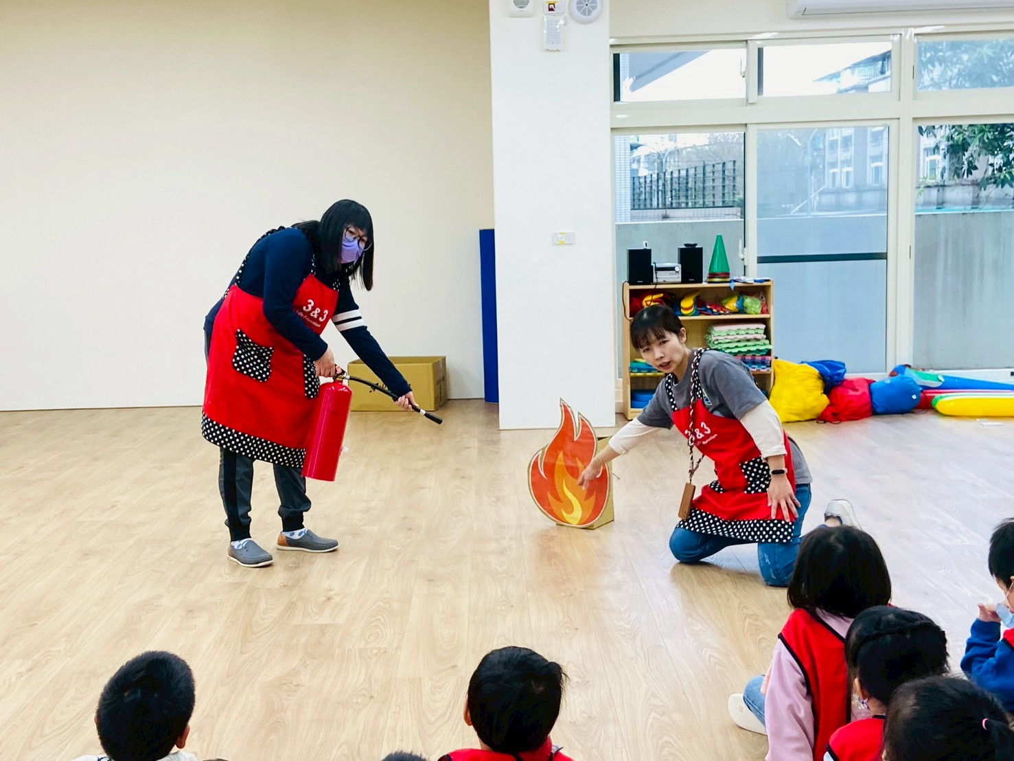 宣導滅火器的正確使用方式,以及火災發生時的注意事項,並透過模擬廚房失火的情境,帶領幼兒進行消防逃生演練。