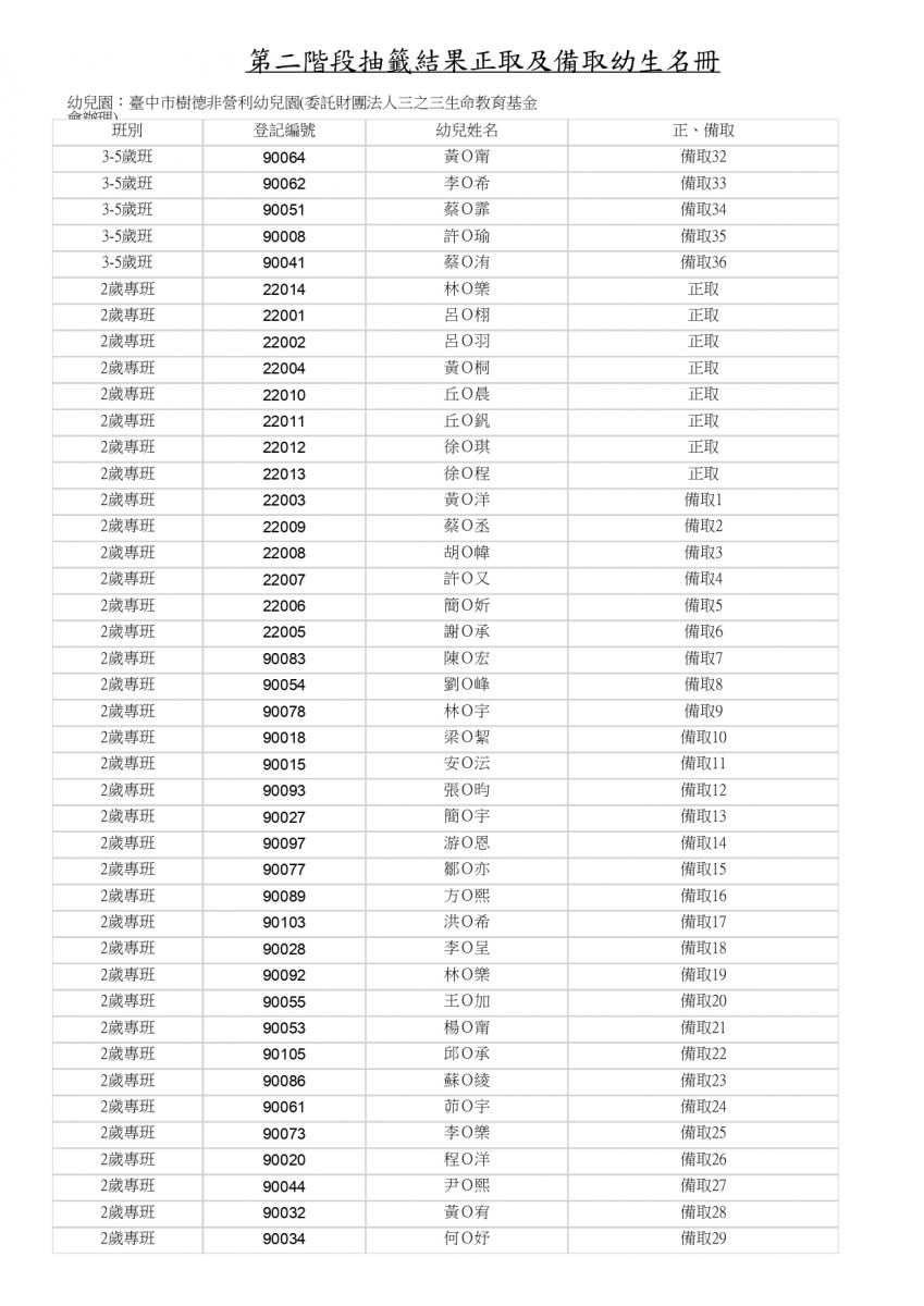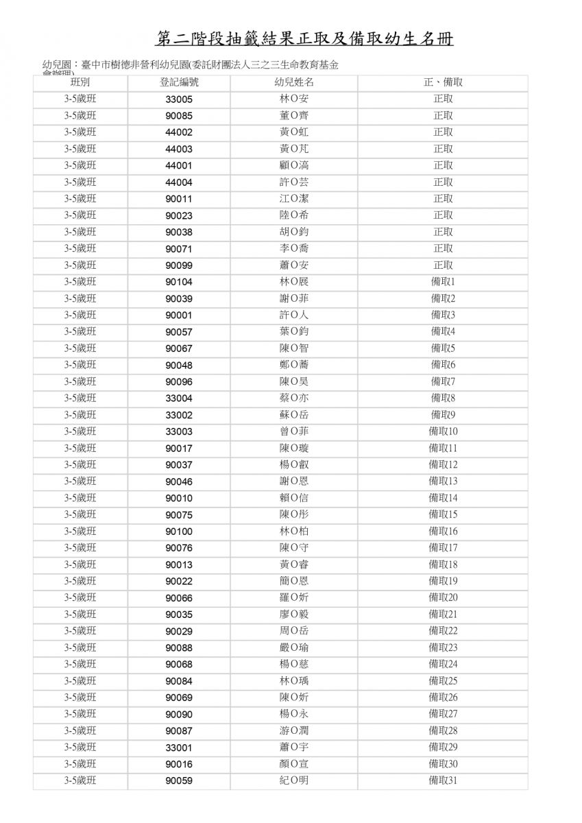 114學年度樹德 第二階段抽籤結果正取及備取幼生名冊