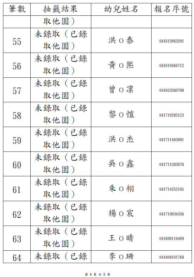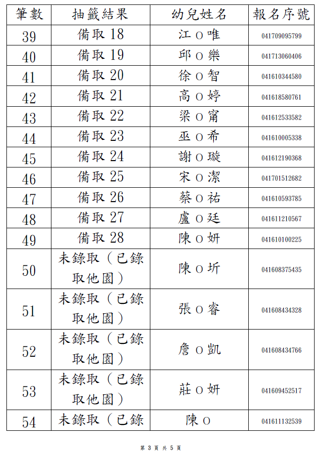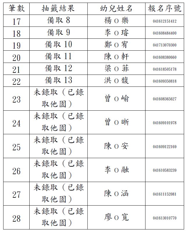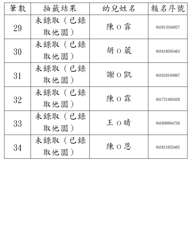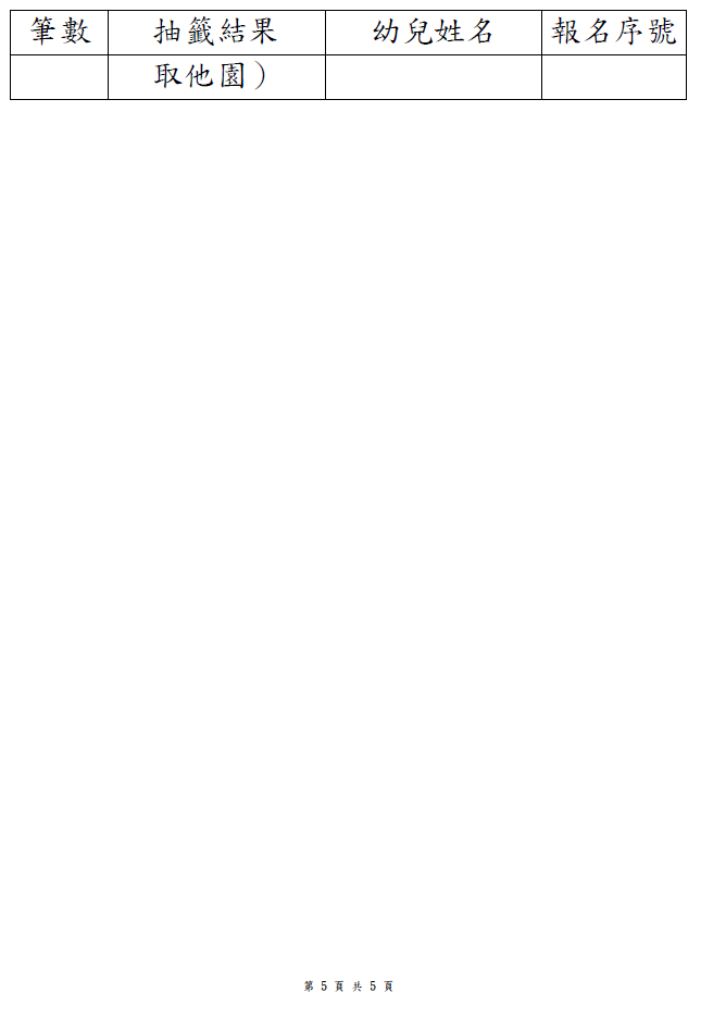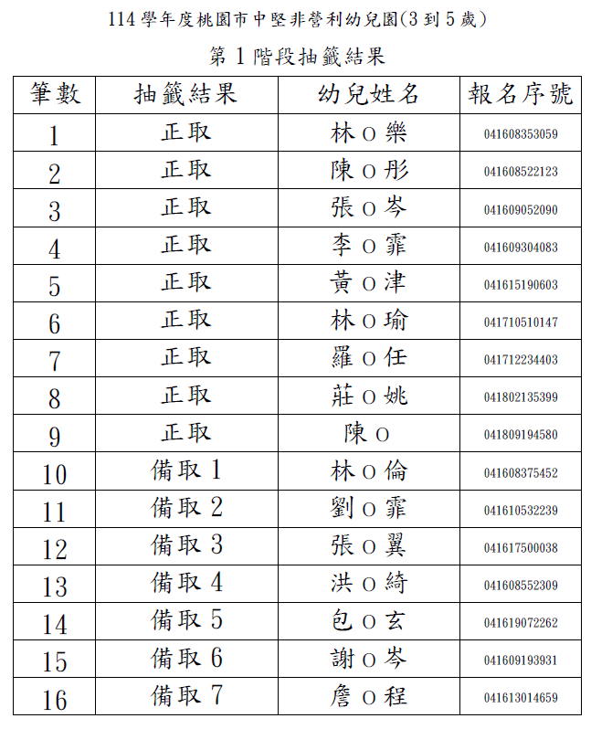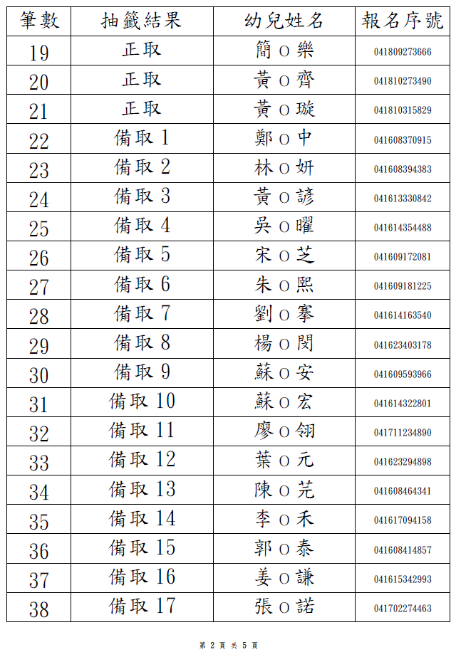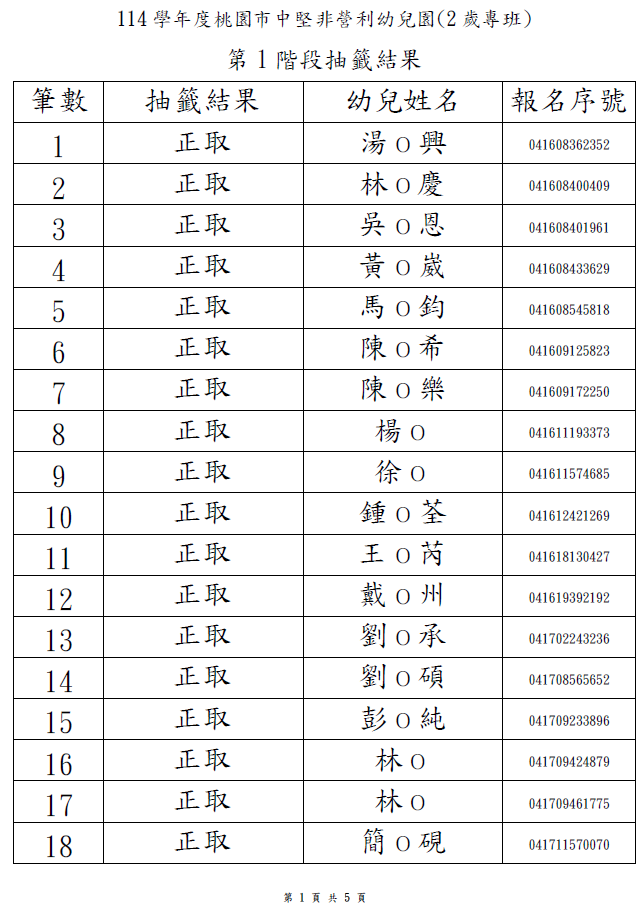 2歲專班-第1階段抽籤結果