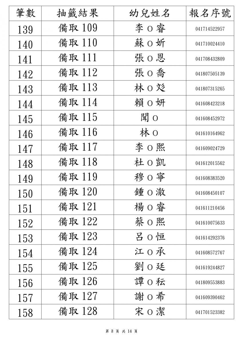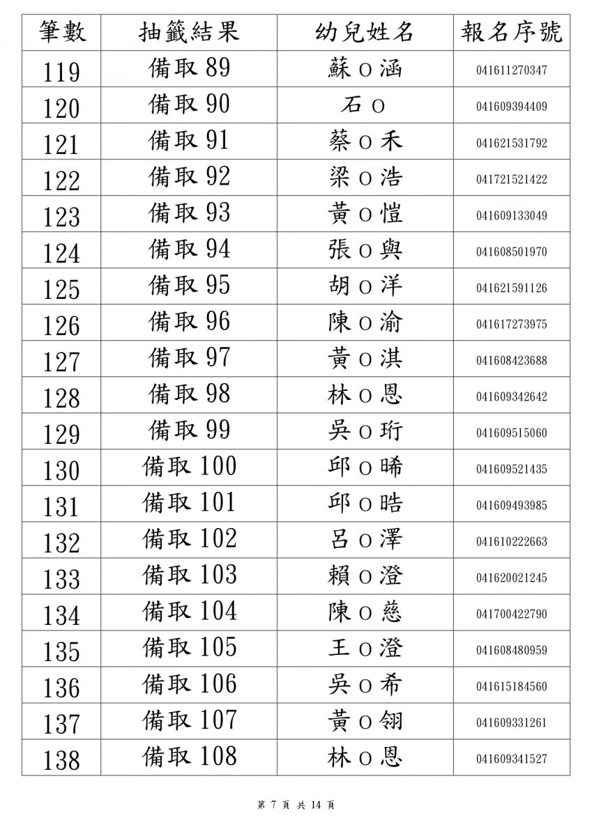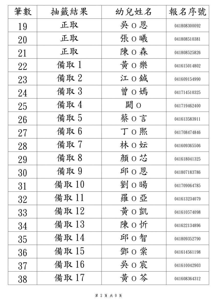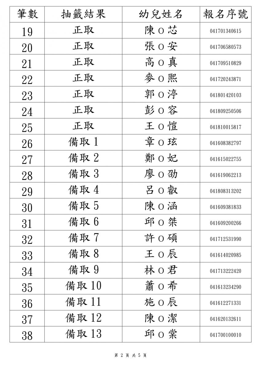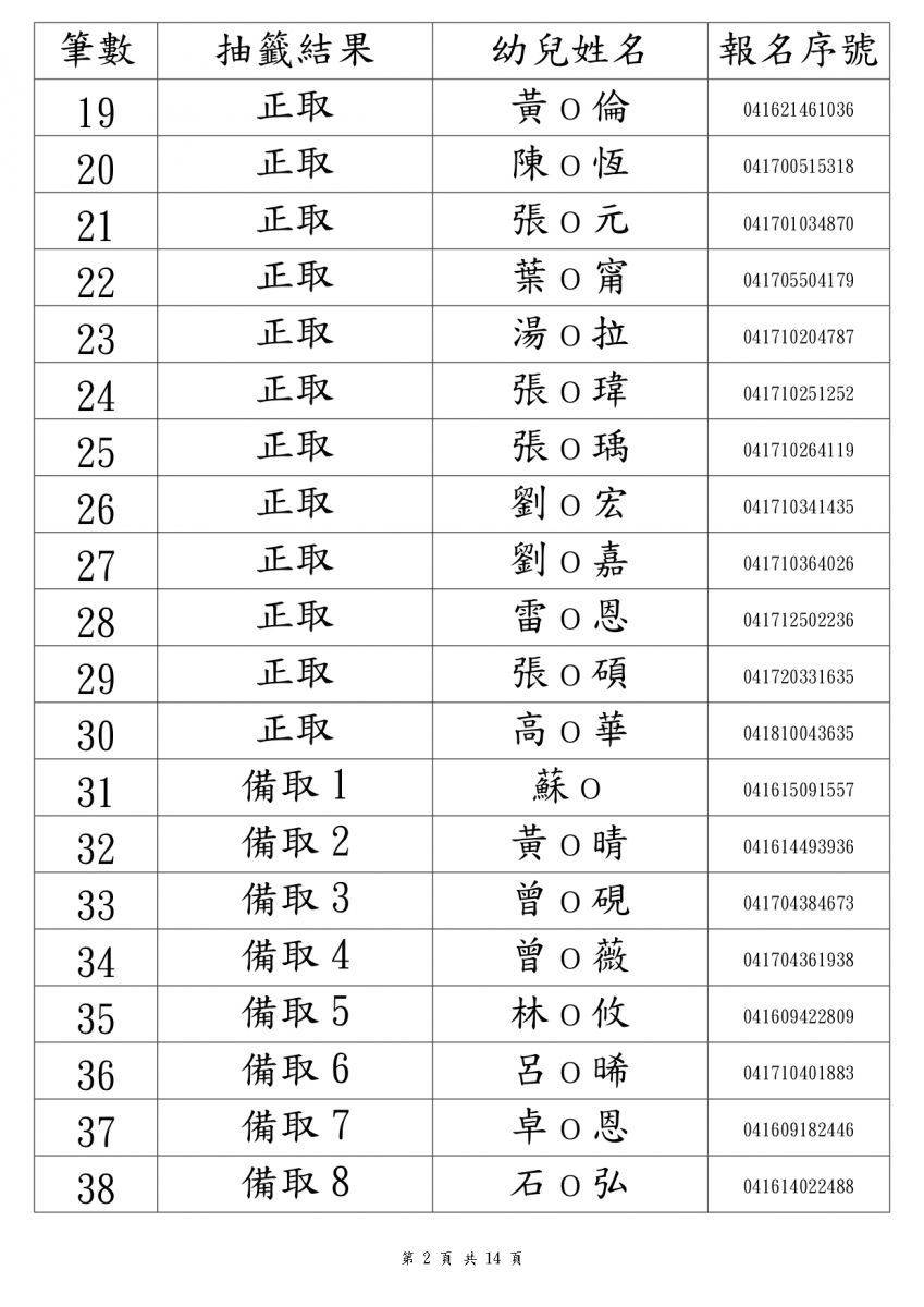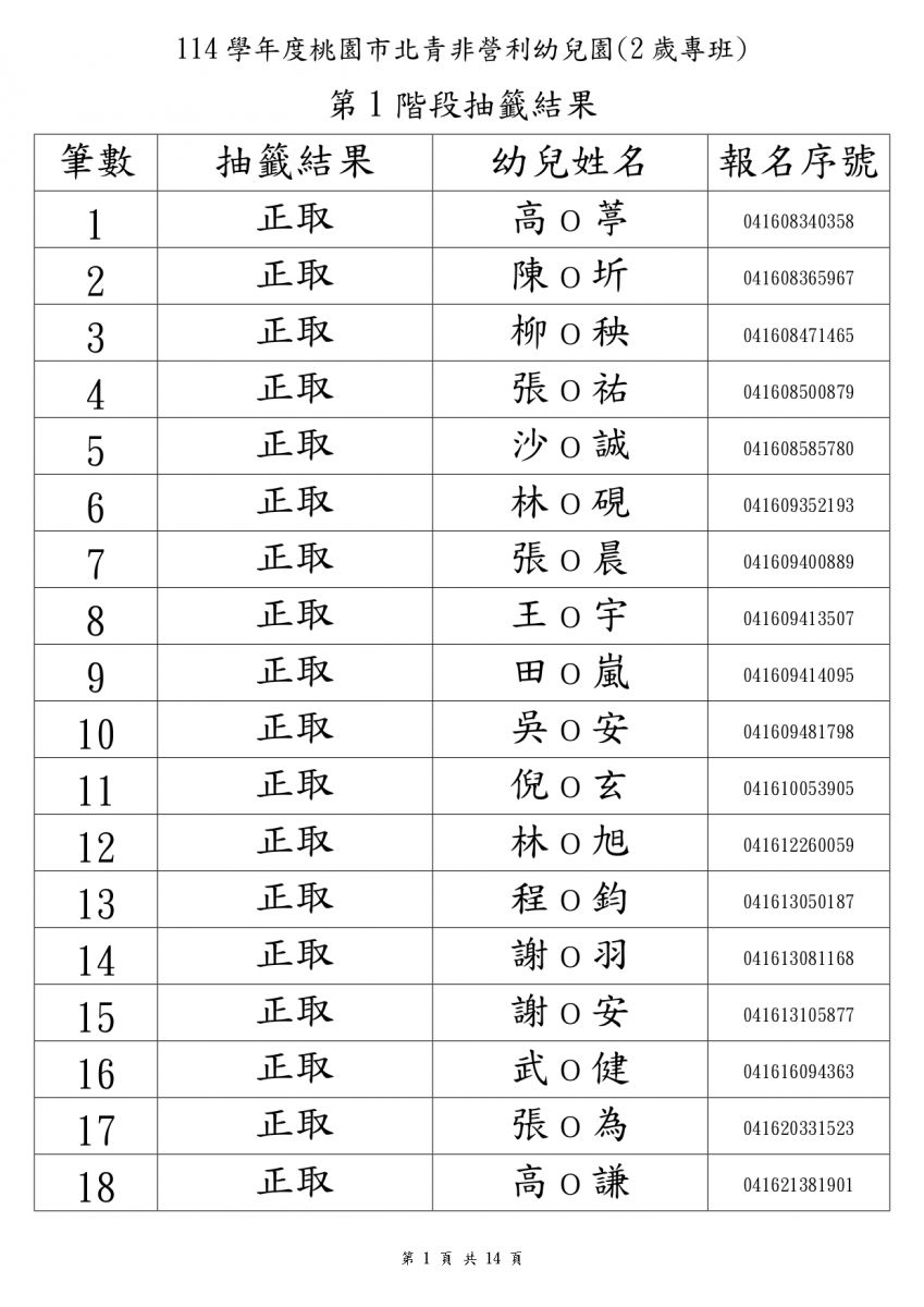 114學年度錄取名單2歲專班