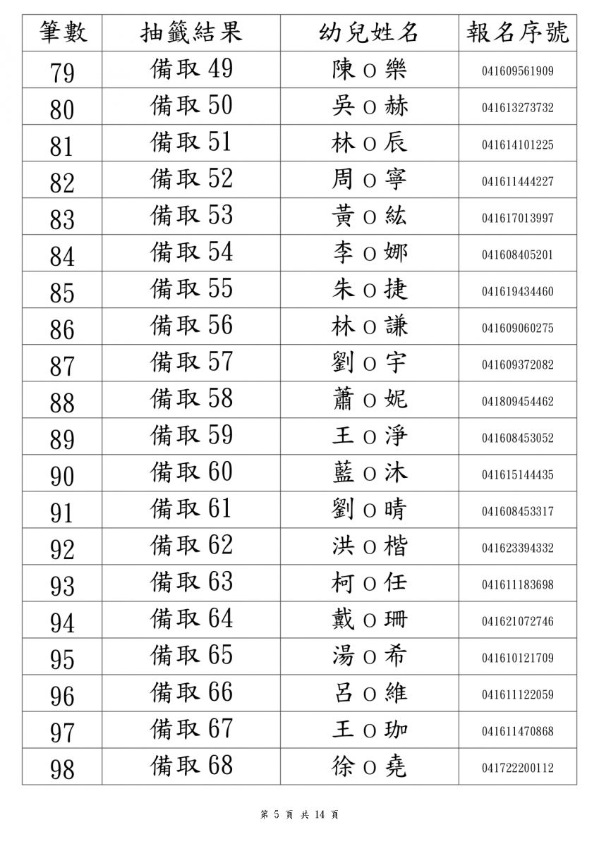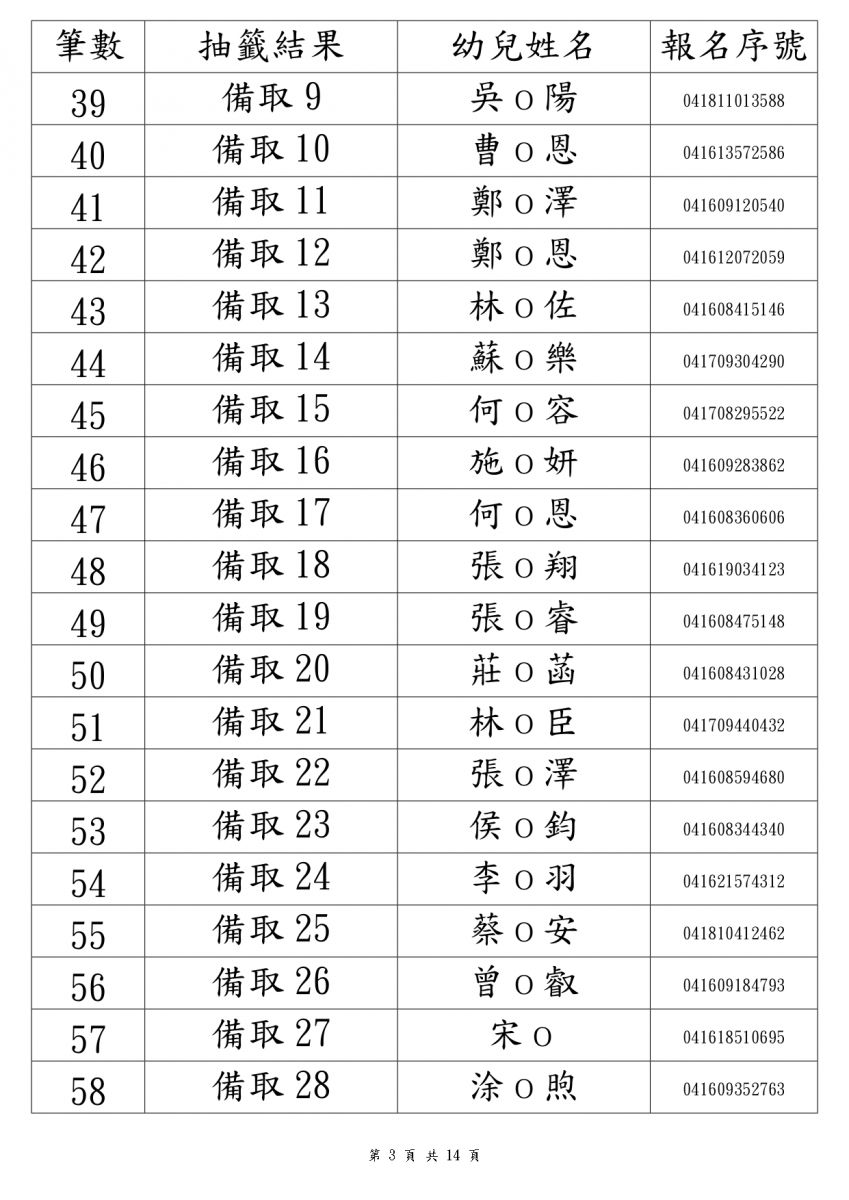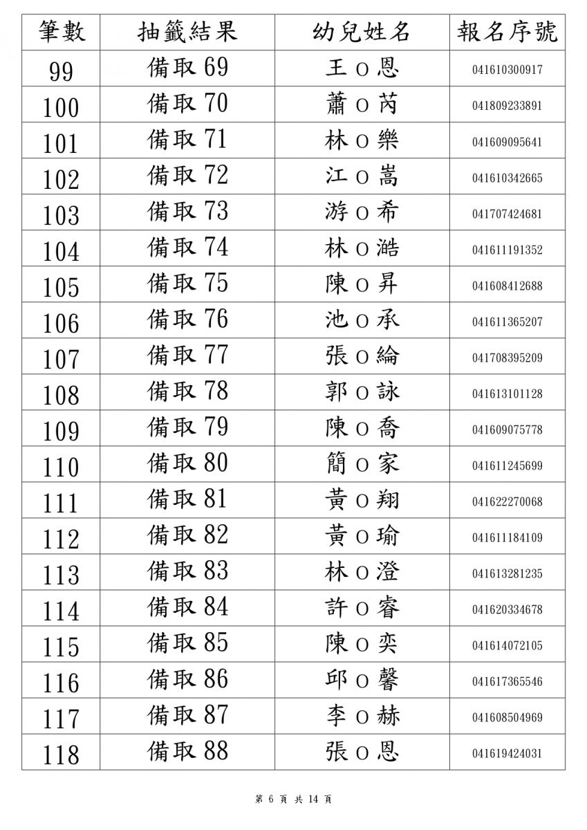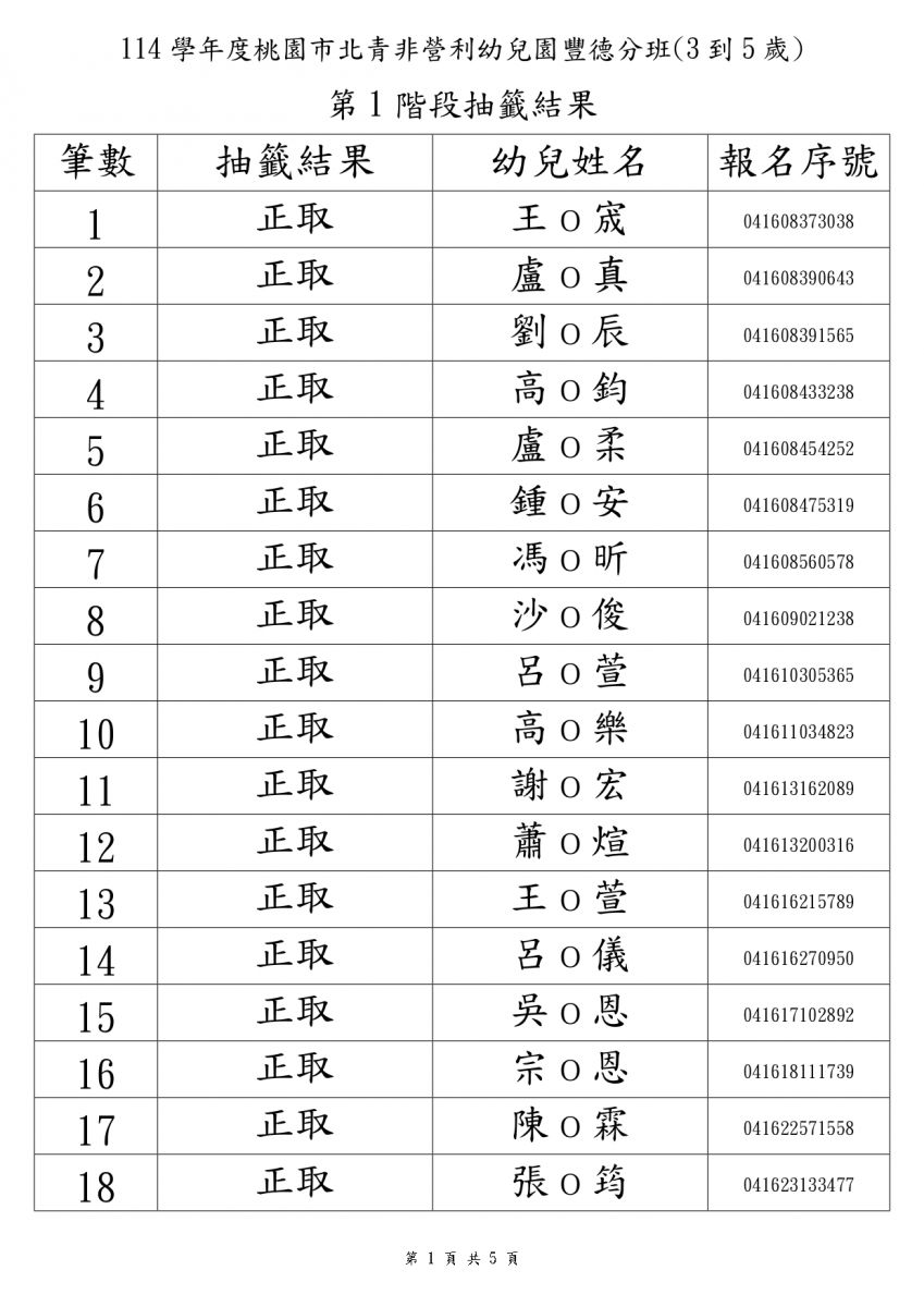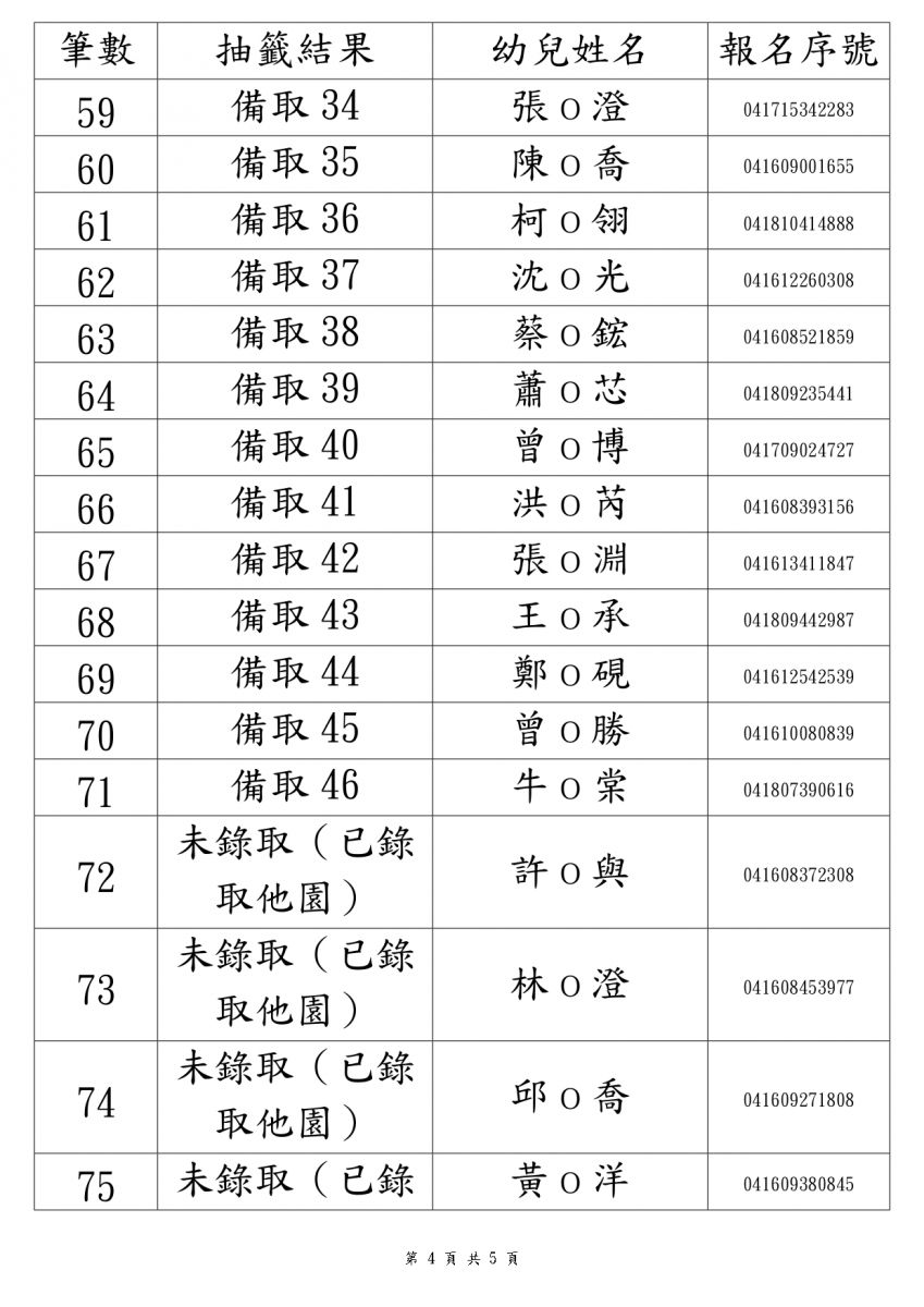 114學年度新生錄取名單3-5歲班(本園)