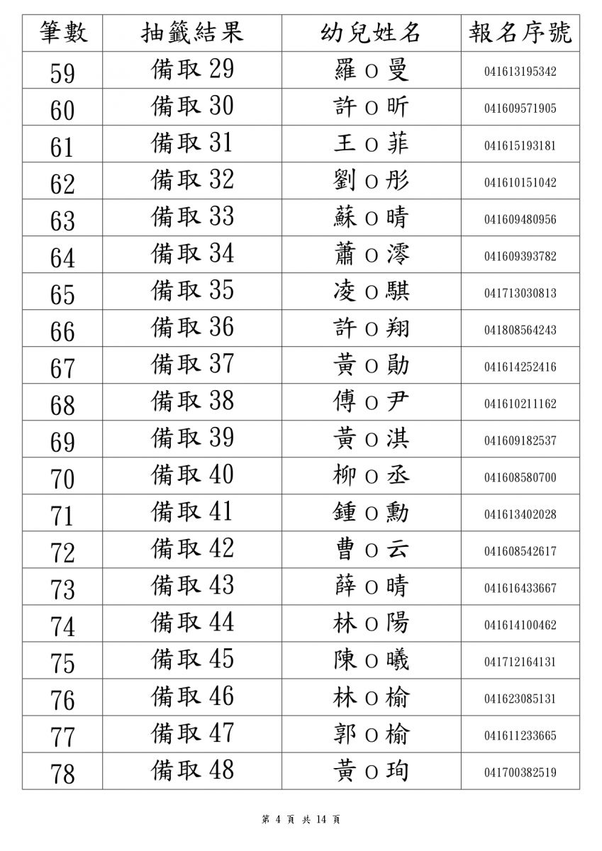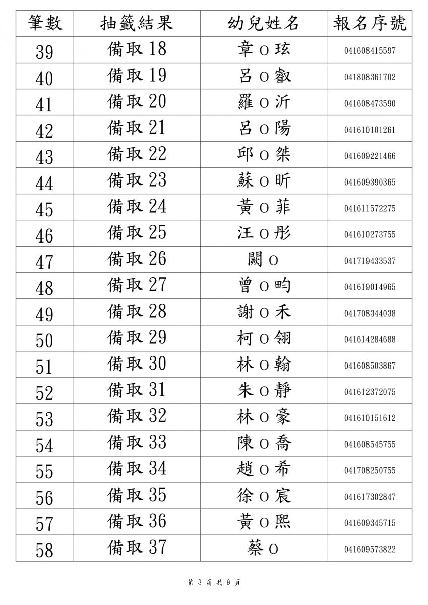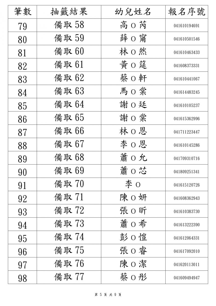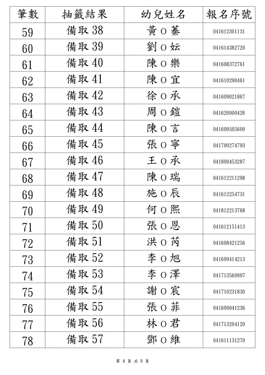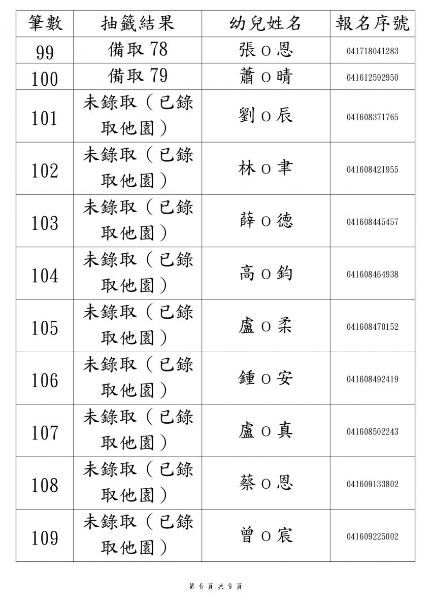 114學年度新生錄取名單3-5歲班(本園)