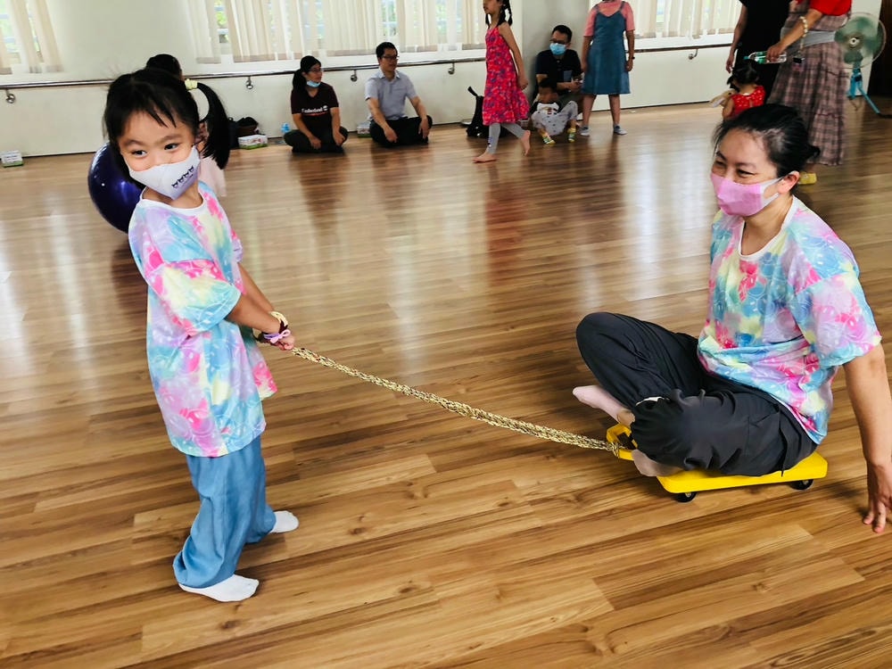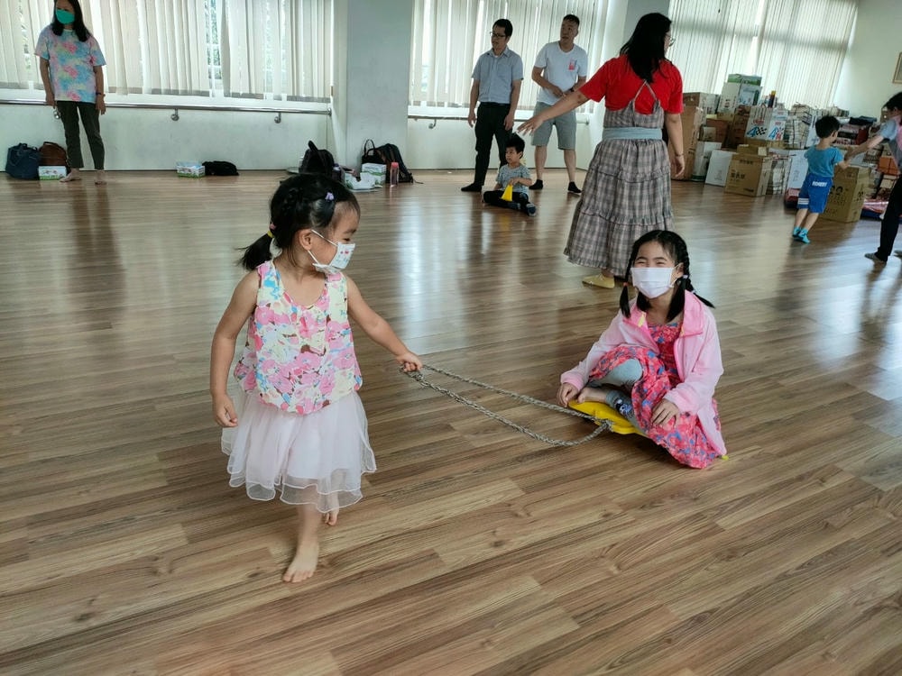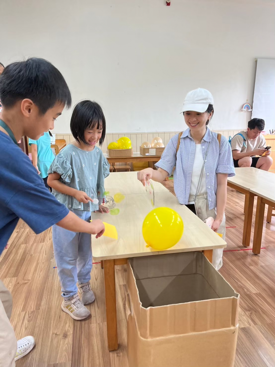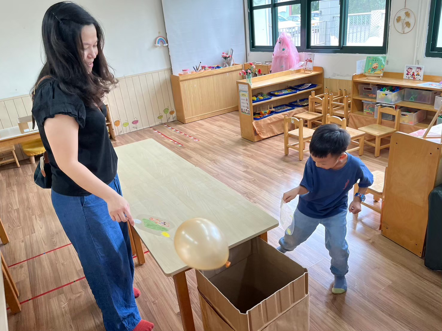 孩子與家人一起合力用扇子搧氣球,將氣球搧進紙箱中,即算完成。