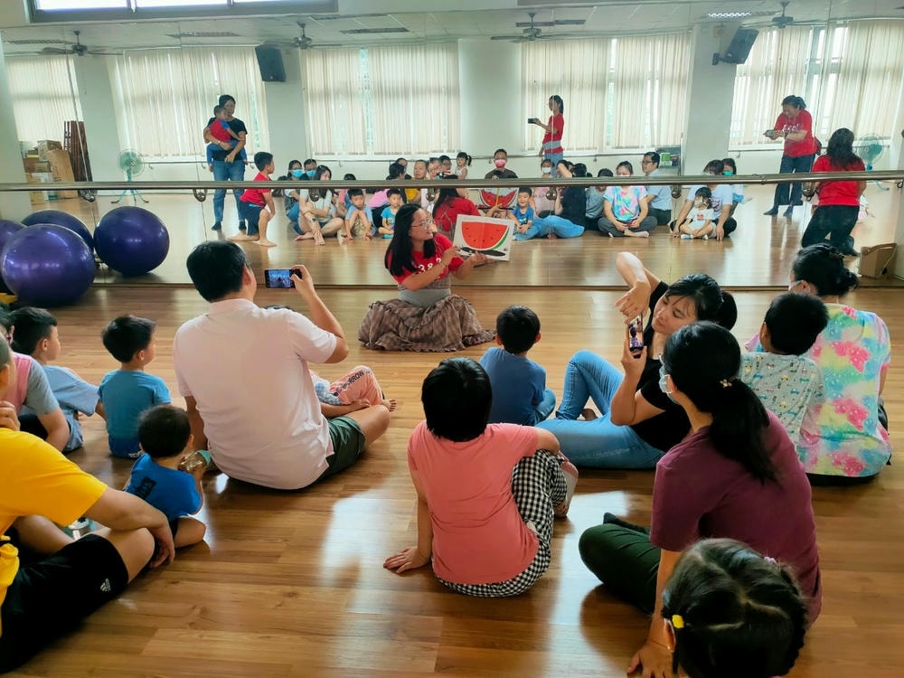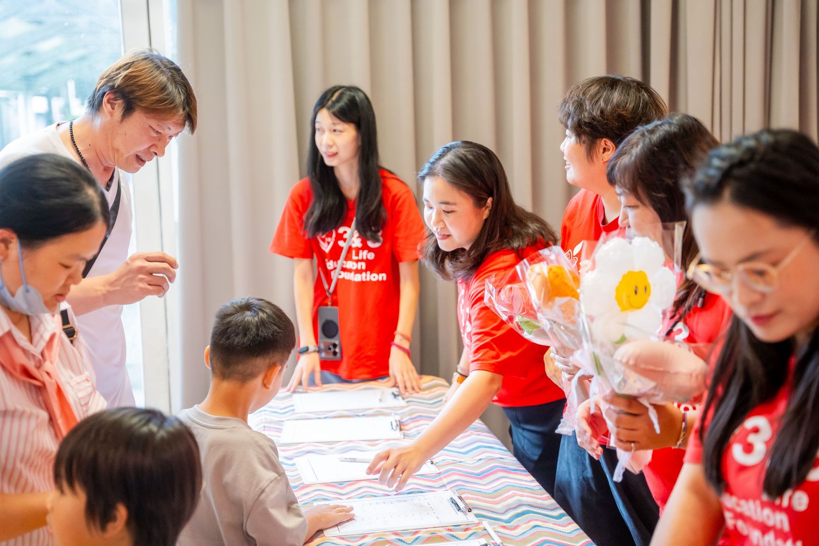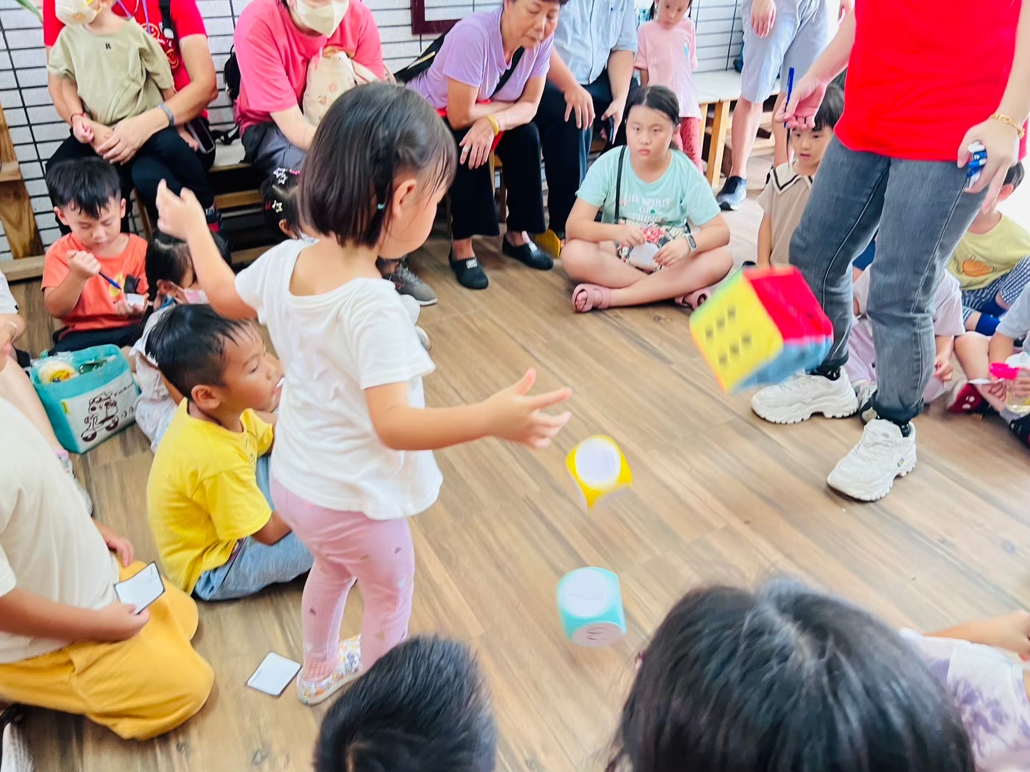 孩子與家人一起合力用扇子搧氣球,將氣球搧進紙箱中,即算完成。