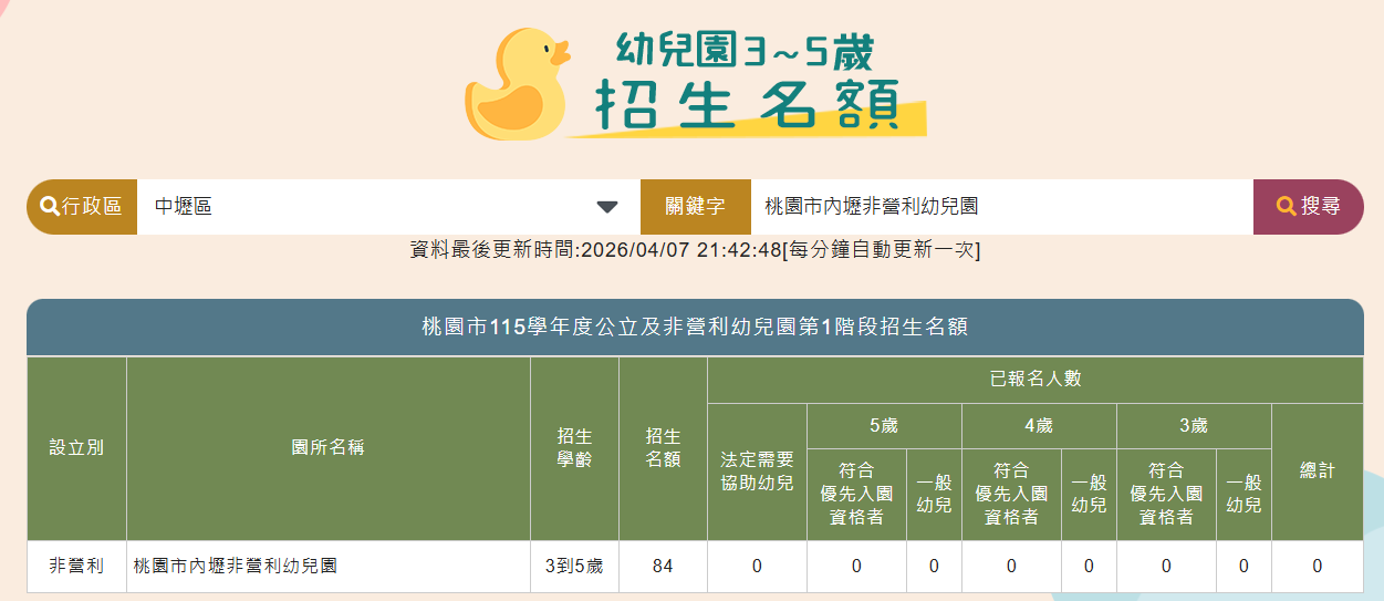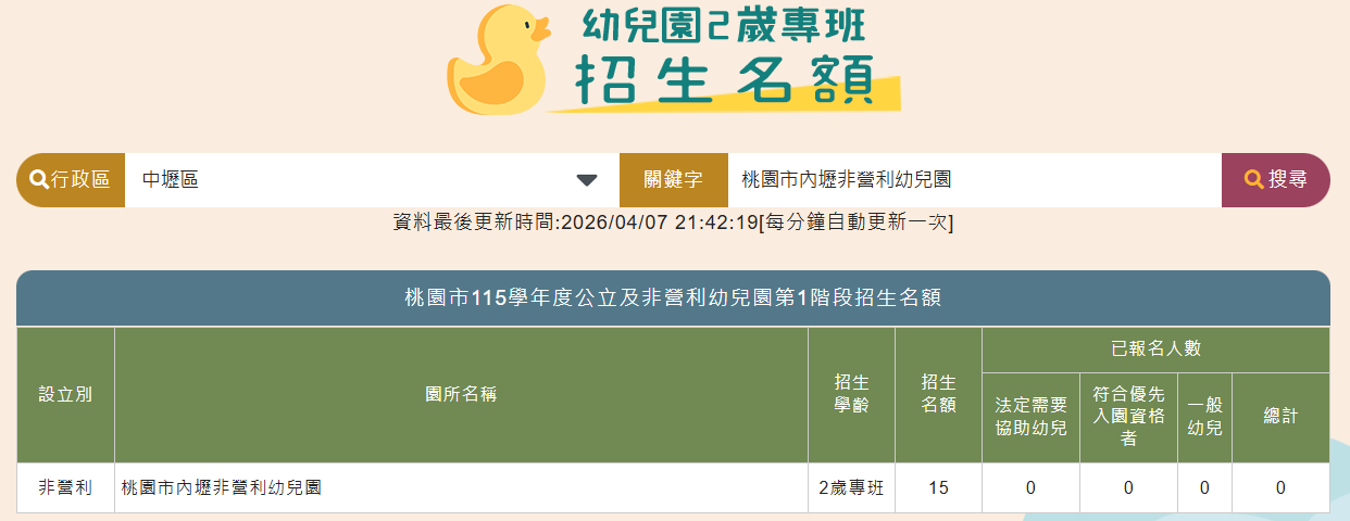 各園招生名額預計於115年4月7日(星期二)公告於本市公立及非營利幼兒園招生網