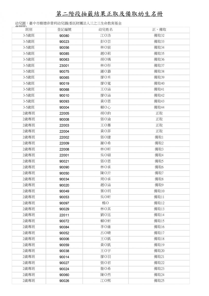 115學年度樹德 第二階段抽籤結果正取及備取幼生名單