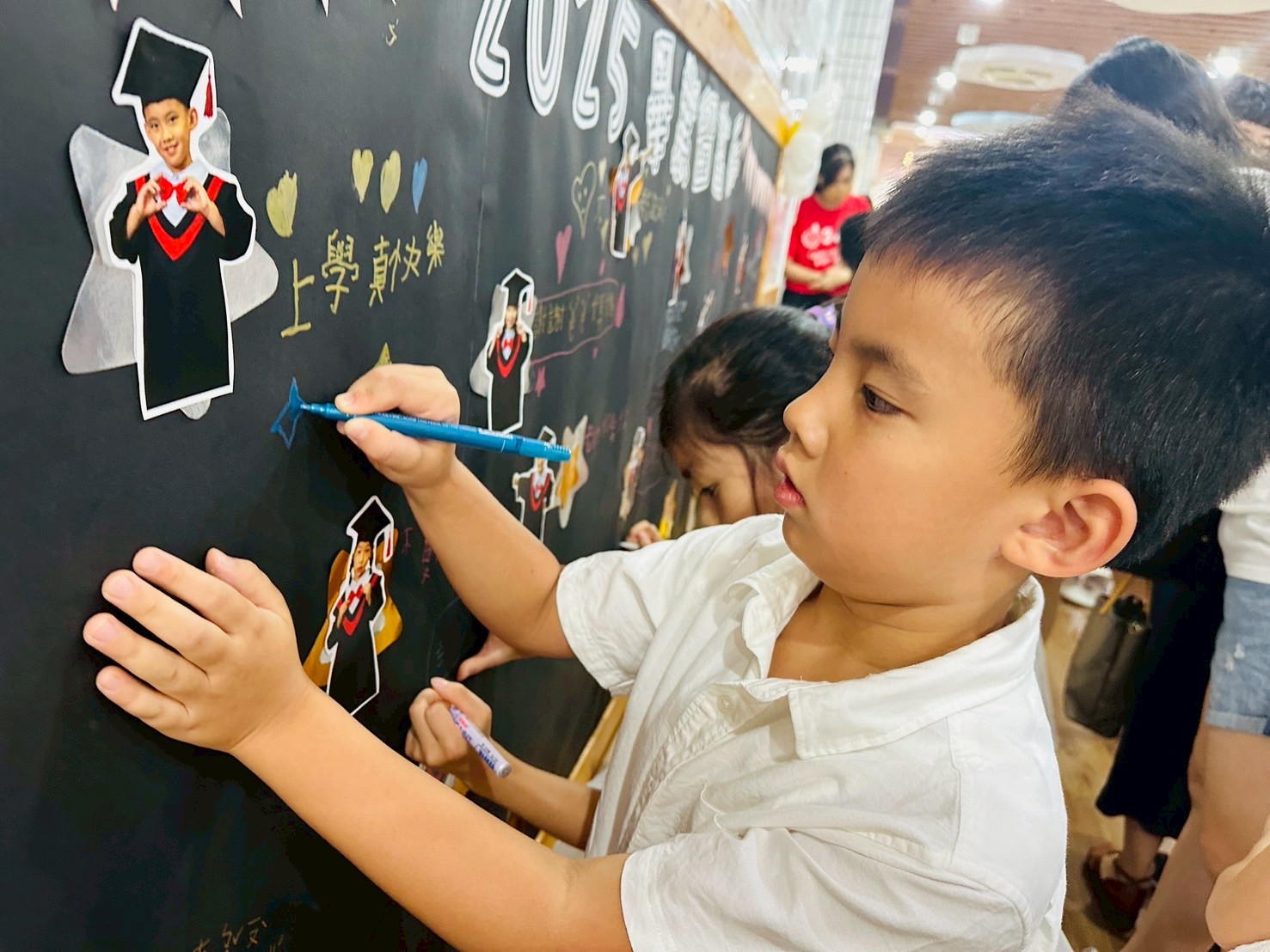 活動在滿懷期待與感動中展開,畢業生們陸續來到會場簽到,並在留言看板前,親手寫下對老師、同學與自己的祝福。這些手寫的話語,如同一封封寫給未來的信,充滿勇氣與希望。隨後展開的【畢業餐會】,我們為孩子們準備了豐盛的外匯餐點與飲品,讓他們能好好享受這場屬於他們的慶典。