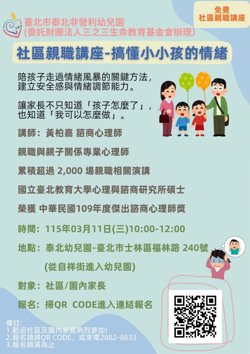 3/11 (三) 社區親職講座▶搞懂小小孩的情緒