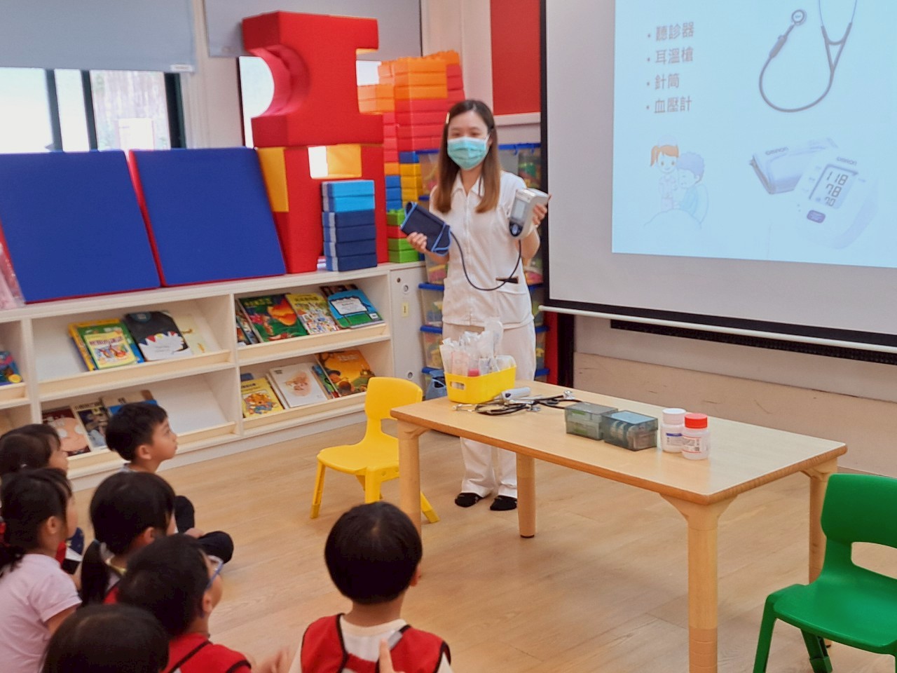 今天我們邀請護理師阿姨到幼兒園,和小朋友們分享她每天在醫院裡的工作內容。孩子們知道了護理師會幫忙量體溫、打針、包紮傷口,也會照顧生病的人,讓他們早日康復。孩子們聽得津津有味,開始對「護理師」這份工作產生好奇和敬佩。