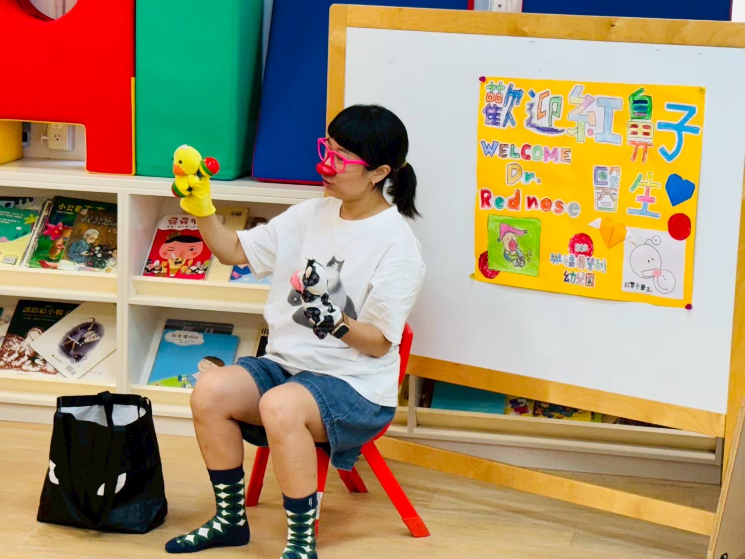活動中,紅鼻子醫生以《葉道瑝與紅鼻子醫生》繪本結合手偶戲,展開幽默又富教育性的說演過程,孩子們專注聆聽、踴躍互動,在問答中展現出高度參與與理解力。
