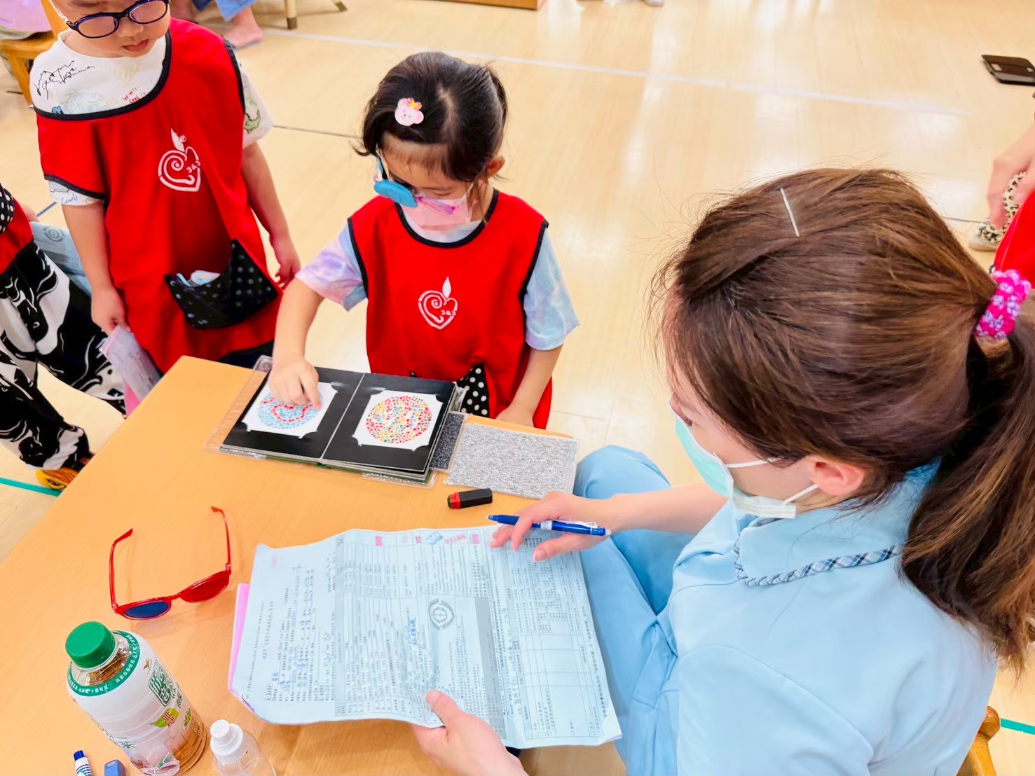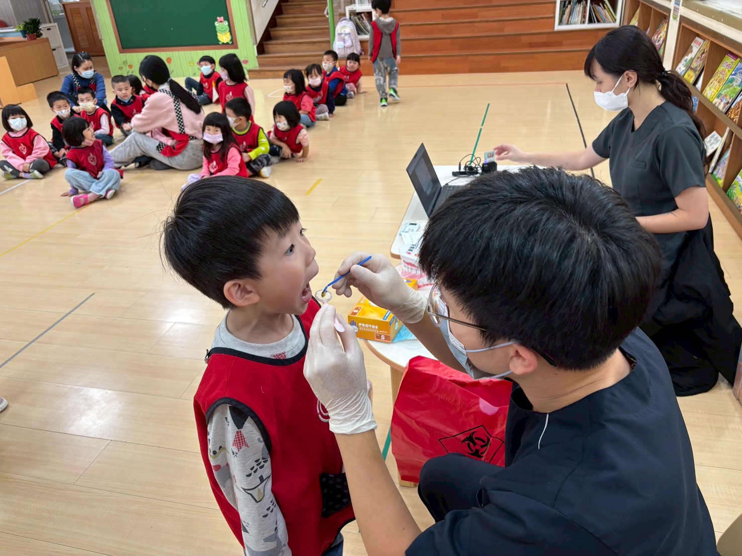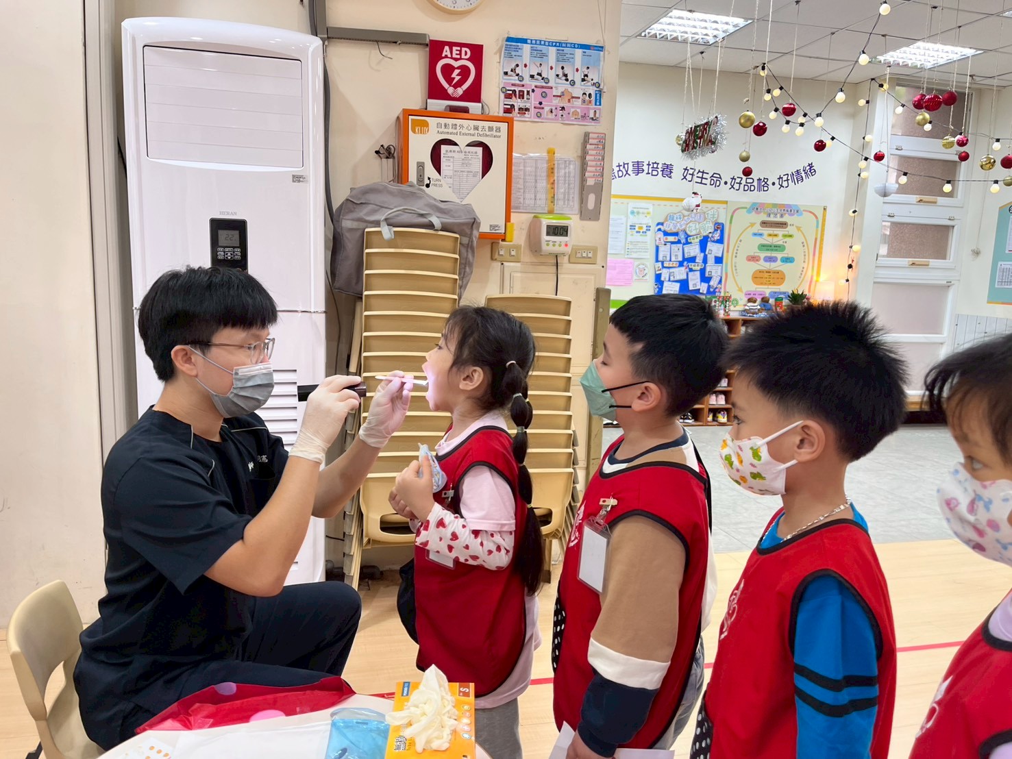 本次健檢與衛生所配合施作愛兒健康檢查活動,檢查的內容包含:口腔、視力及聽力等基本檢查。