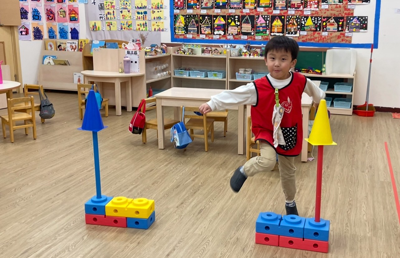 老師帶領幼兒在團體活動中,應用身體基本動作安全的完成任務,並訓練手眼協調與平衡動作。