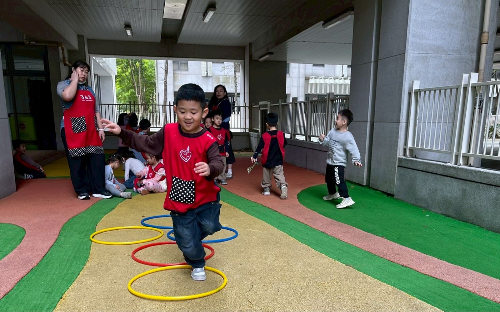 孩子們手握呼拉圈,在老師的引導下,穿梭於排列整齊的三角錐之間。有人快速衝刺,有人小心轉彎,還有人將呼拉圈舉高、跨過、滾動,讓跑步的過程充滿創意與笑聲。這場「呼拉圈接力賽」不僅讓孩子們盡情奔跑、釋放活力,更在變換方向與速度的過程中,培養動作的靈敏度與協調性,提升平衡感與空間判斷力,強化全身肌肉控制與體能發展。