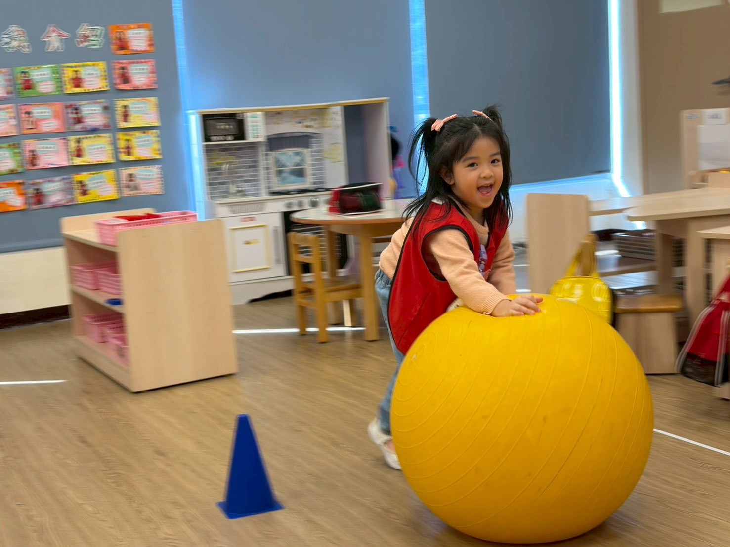 在老師的引導下,孩子們抱著大龍球奔跑,促進身體穩定性及移動性的的發展。透過有趣的體能挑戰,孩子學習覺察身體在穩定與移動間的變化,建立良好的身體協調與自信心。