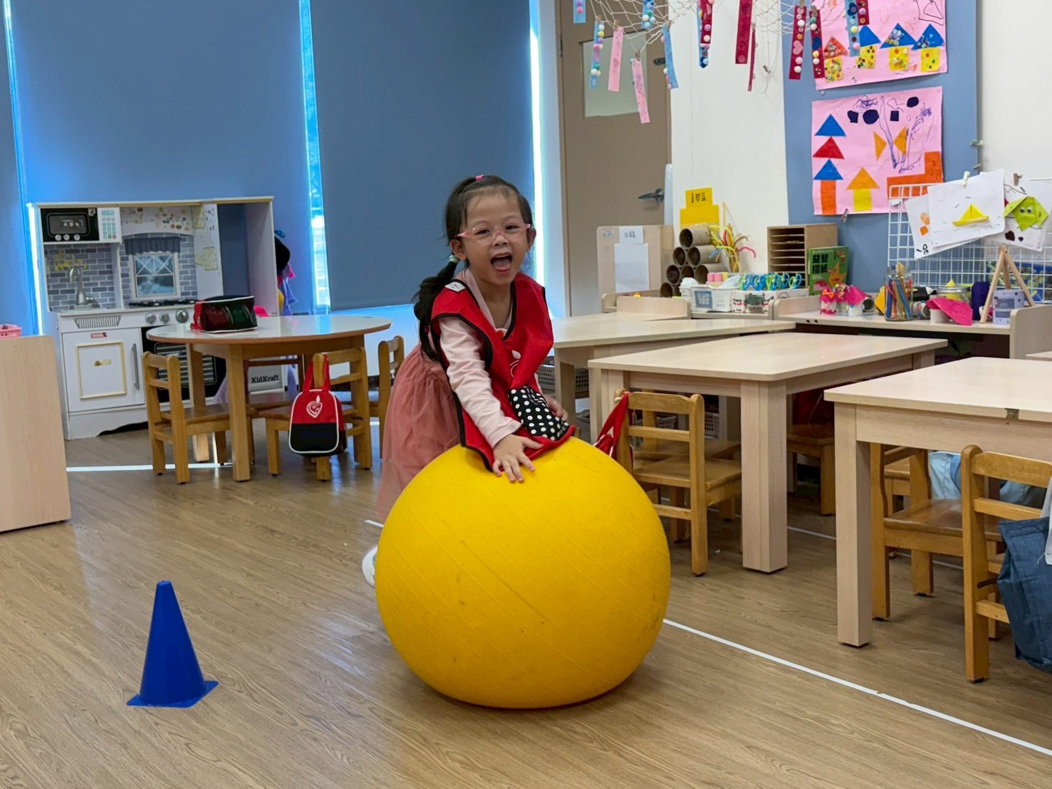孩子們在老師的帶領下拿起小布球,開心地練習丟、拋、接,穿梭在三角錐之間,不僅玩得投入,更在過程中自然練習身體的協調與控制力。透過遊戲,孩子們逐漸覺察自己的動作表現,在穩定與移動中找到身體的平衡與節奏感。