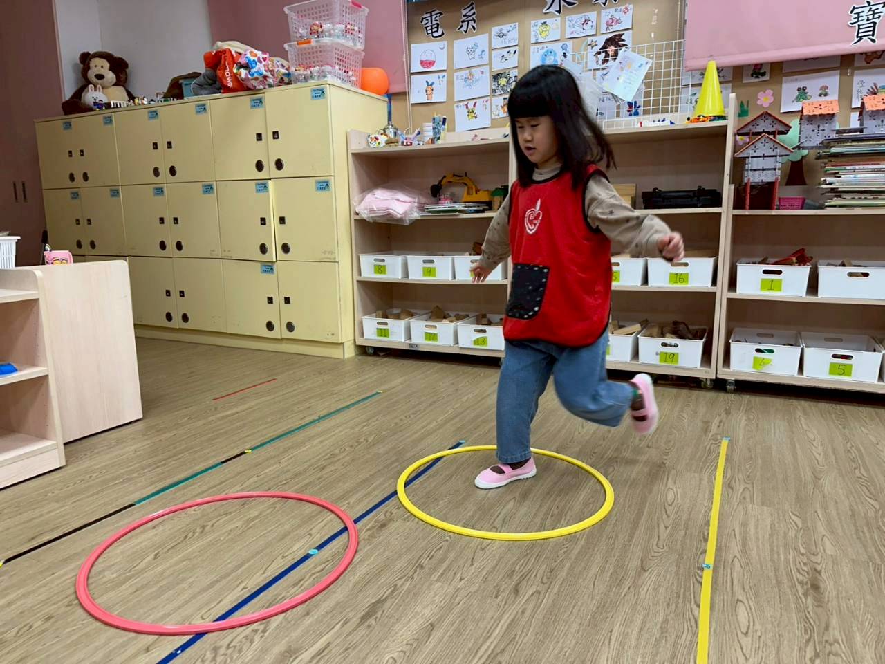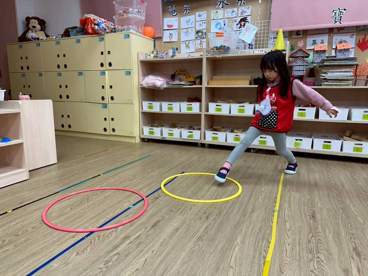 孩子們透過連續跳躍呼拉圈障礙物,與行走萬象組的挑戰,練習下肢肌耐力與身體協調性,活動同時模擬各種動態平衡動作,提升幼兒的專注力與身體控制能力,讓孩子在遊戲中強化動作發展。