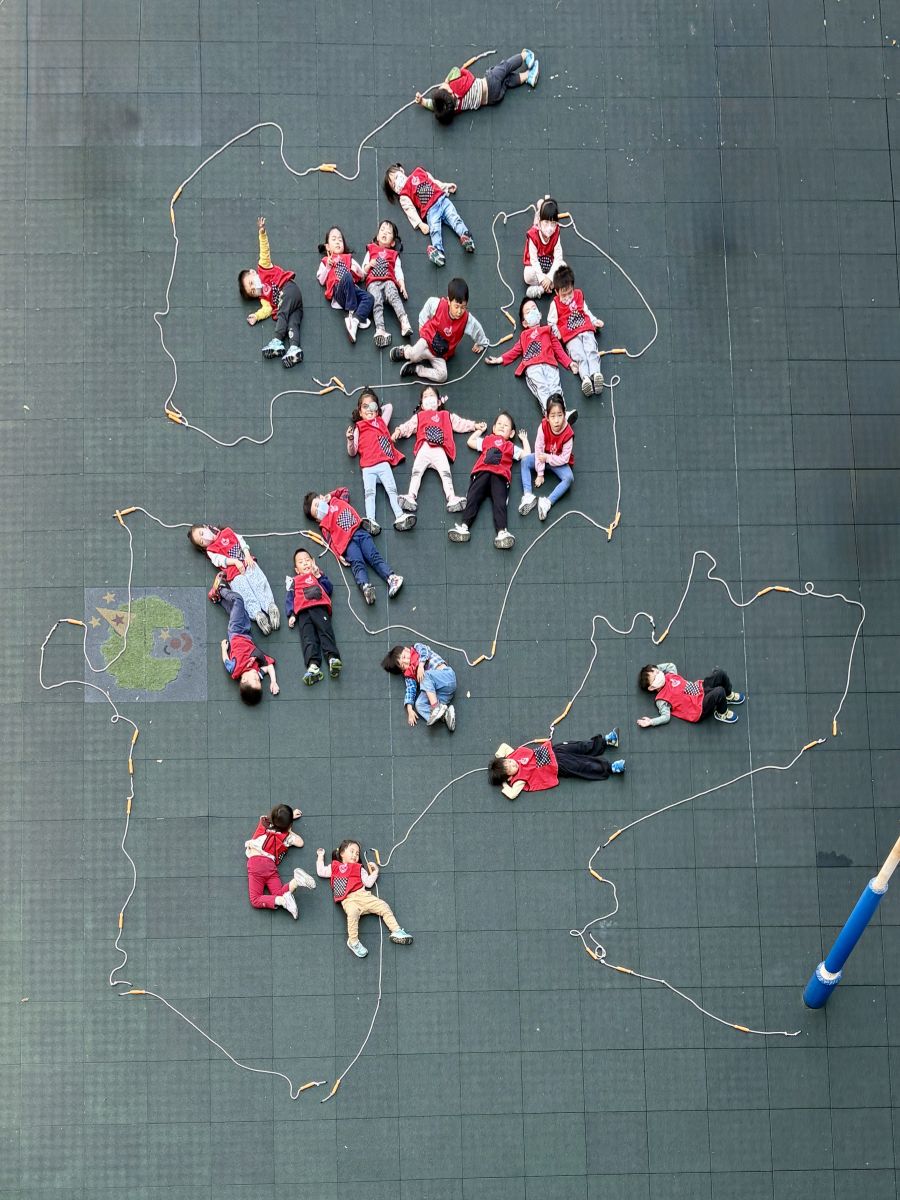 在尋找色彩的過程中,孩子注意到身邊的形狀,於是我們一起除了認識圓形、三角形、方形、心形等形狀,並試著用跳繩排列出來,之後也用了七巧板及六形六色進行創作,從中覺察形狀之間的關係,最後,孩子們發揮創意,將形狀色紙拼貼組合成獨具創意的作品。