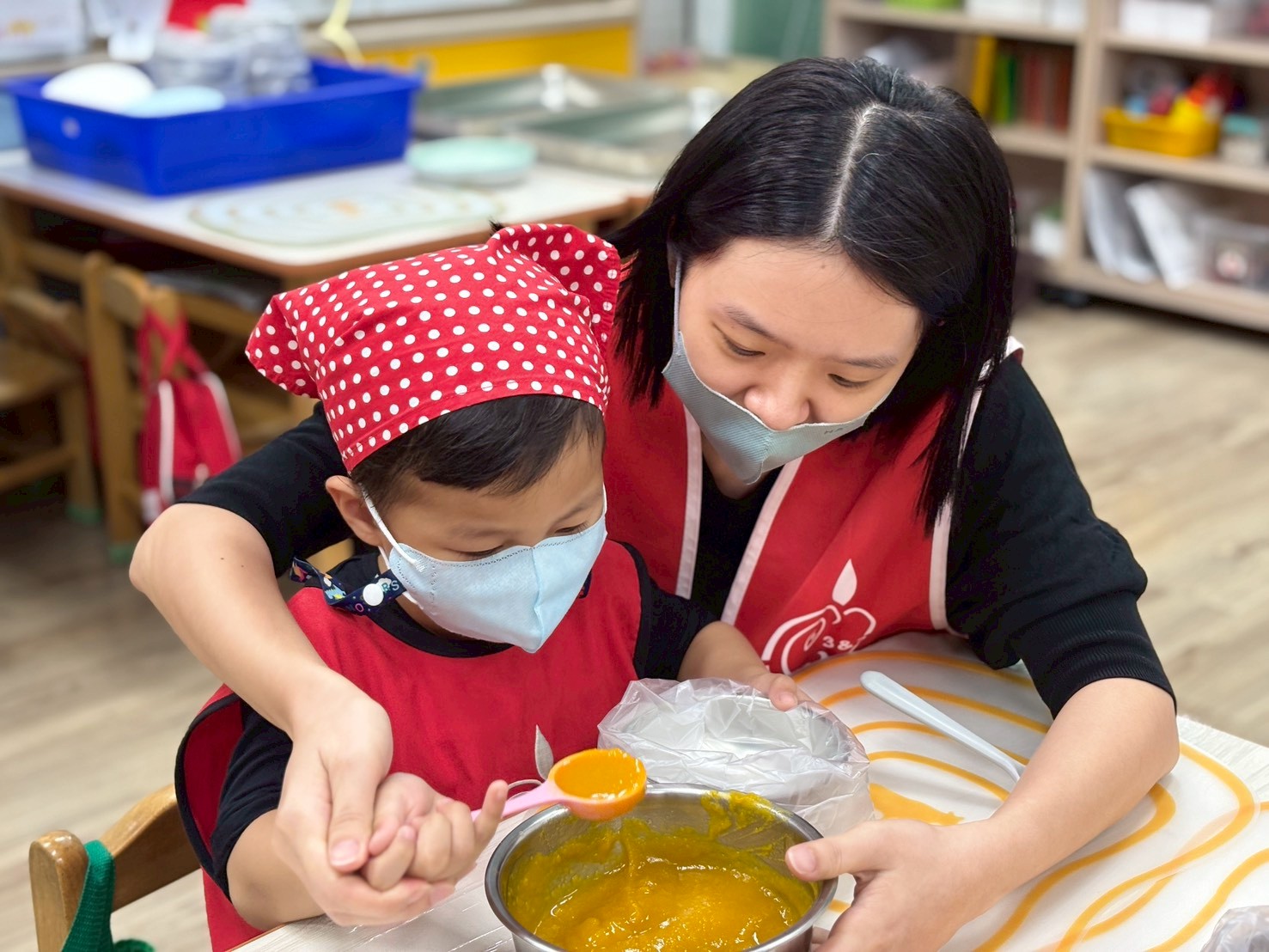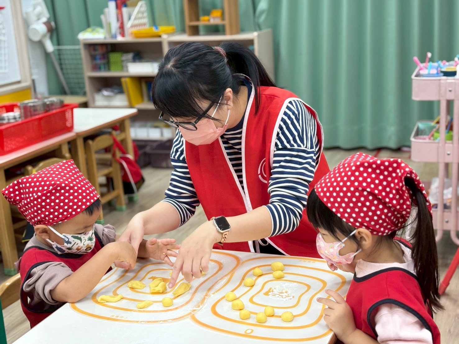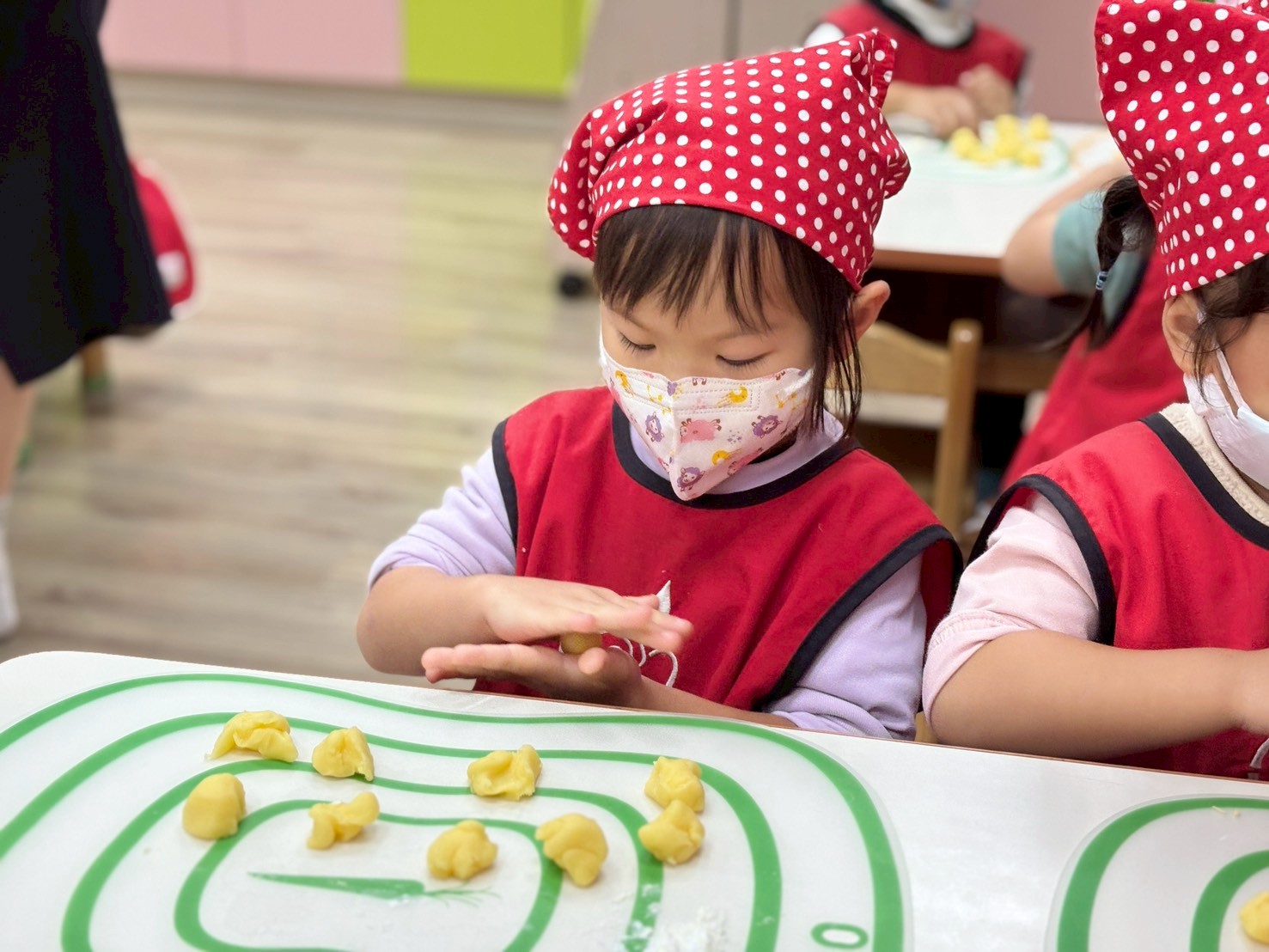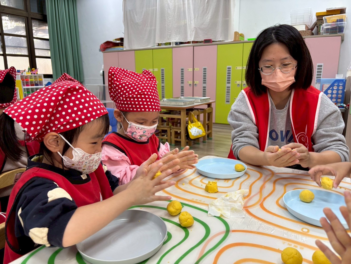 簡單的小點心藏著各種手眼協調動作的練習,像是攪拌、平分、搓圓......等技巧,完成的小饅頭餅乾更是藏著孩子們的用心與分享的心意。