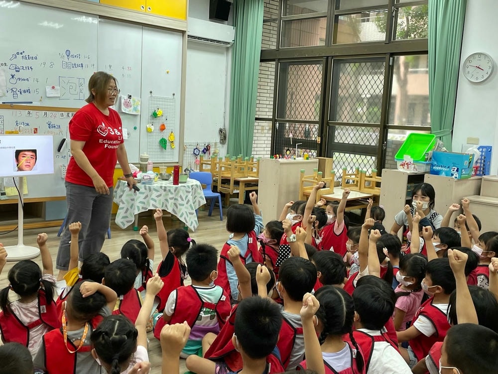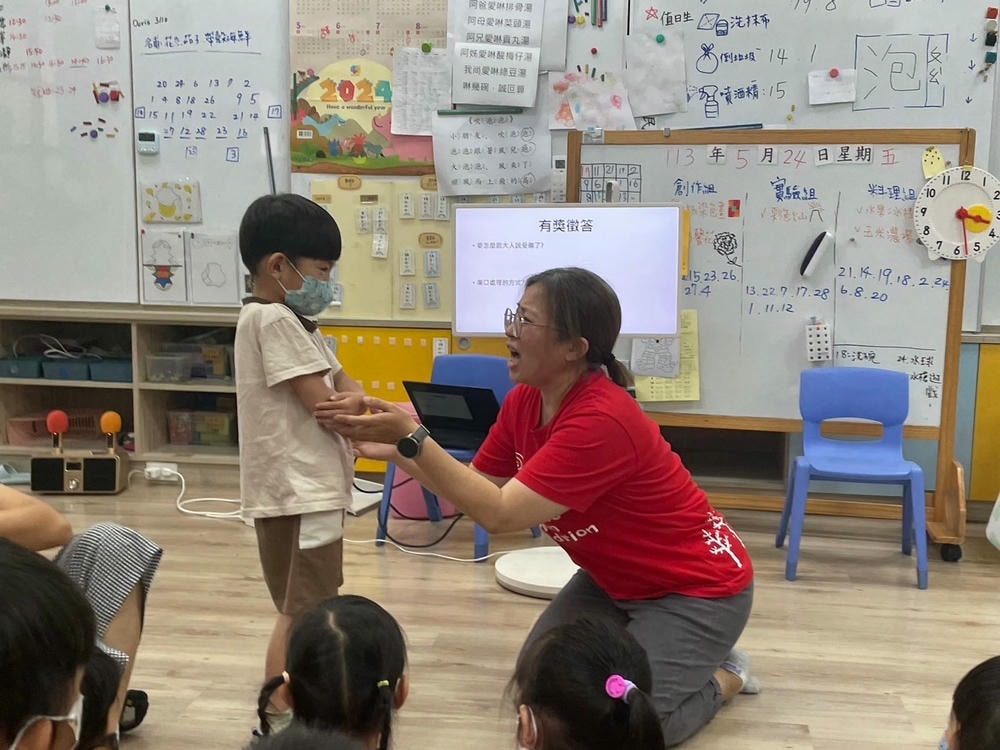 流鼻血了,怎麼辦?園長媽咪到訴我們流鼻血不要緊張,要把頭低下來,壓住鼻子的上方止血,大家都很認真學習呢!