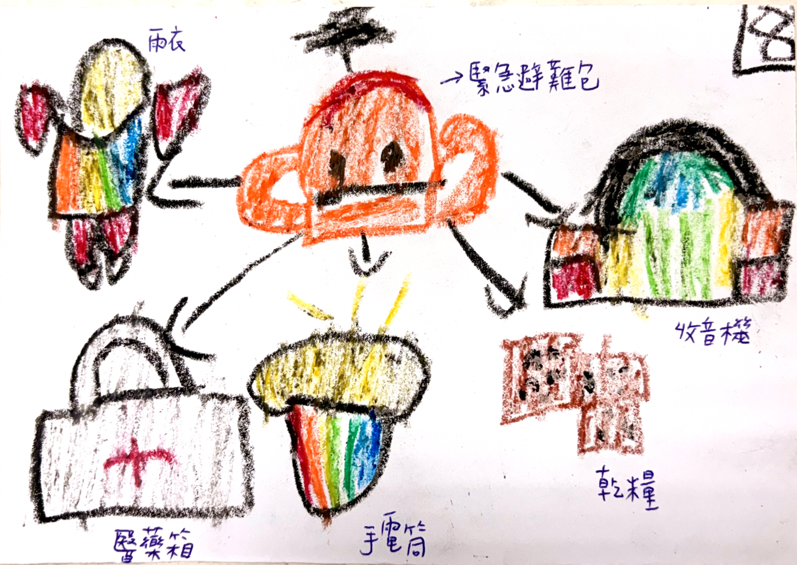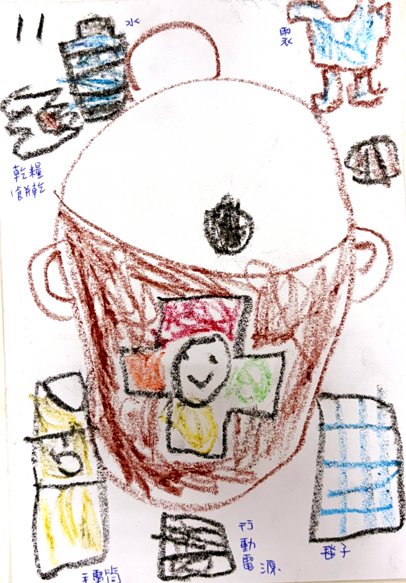 地震在台灣是隨時都可能發生的事情,而颱風也是在每年的7-9月都會影響我們的生活,透過講解與實際演練,寶貝了解防災和緊急避難包的重要,回到教室後,還有寶貝畫下了緊急避難包需要的物品,要和家人一同準備。