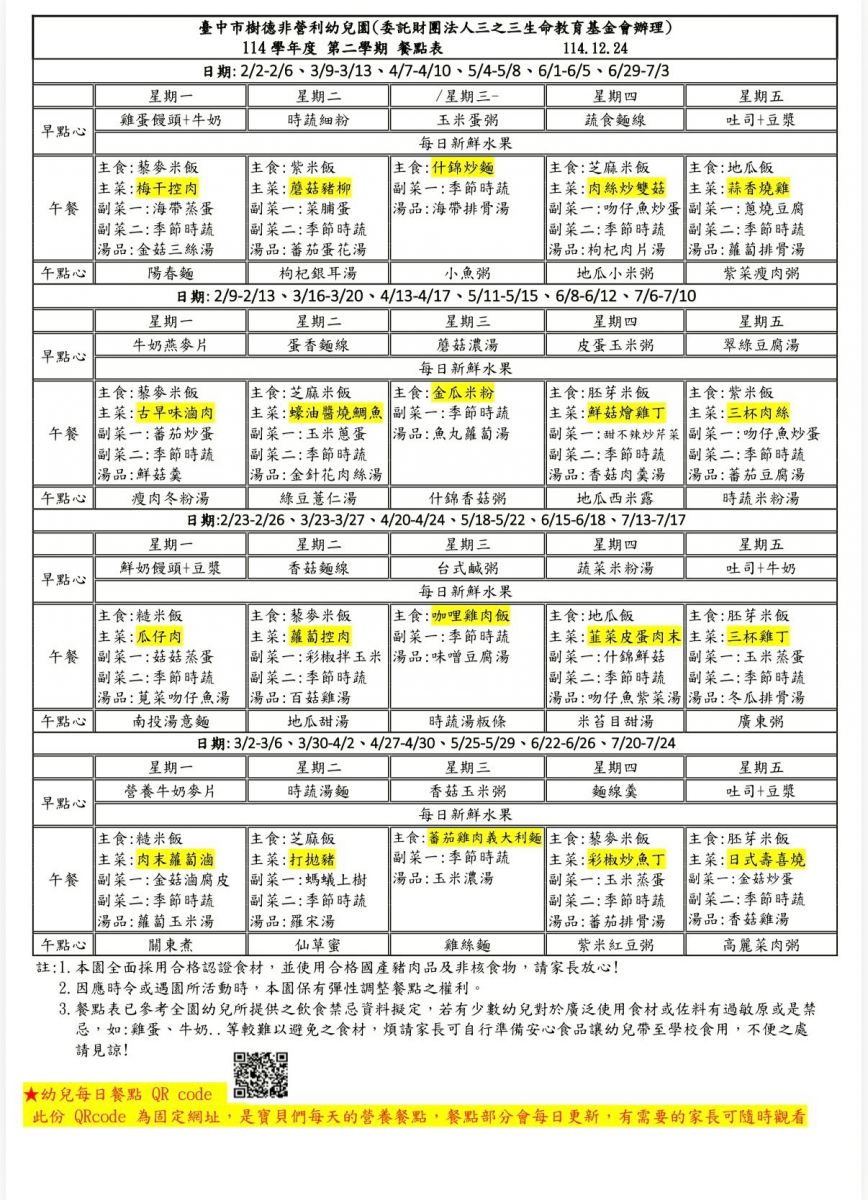 樹德非營利幼兒園 餐點表