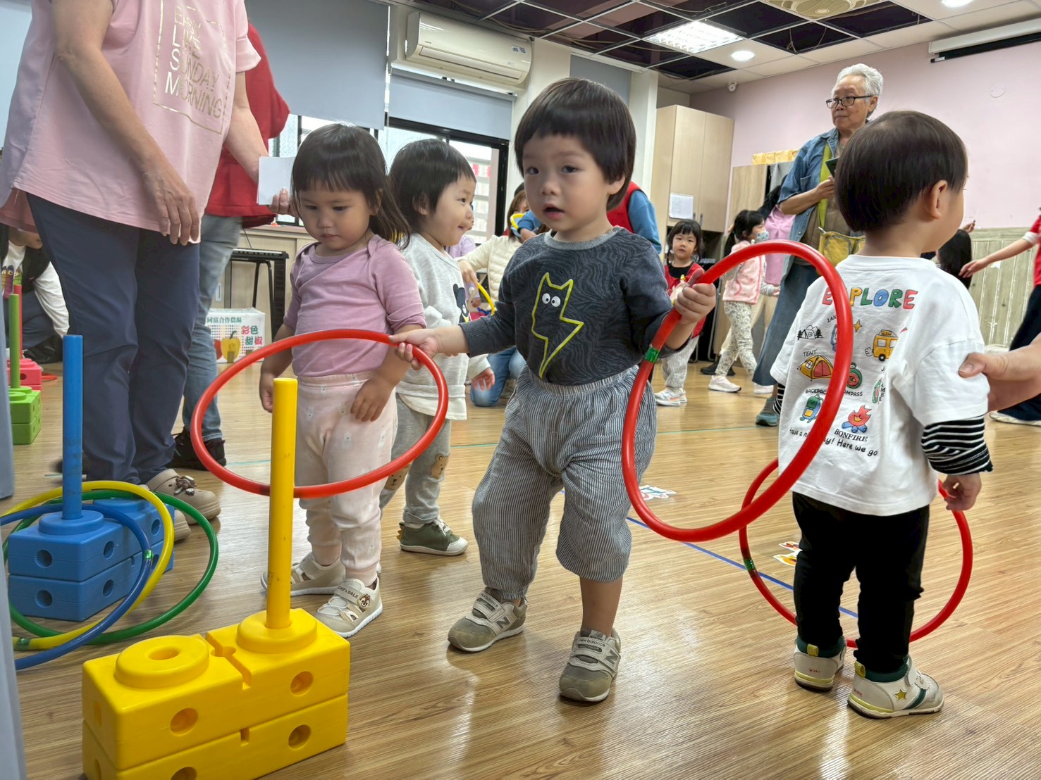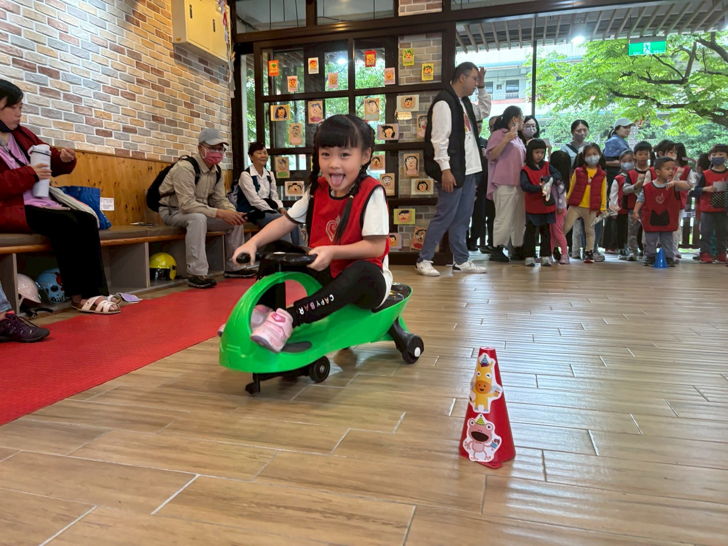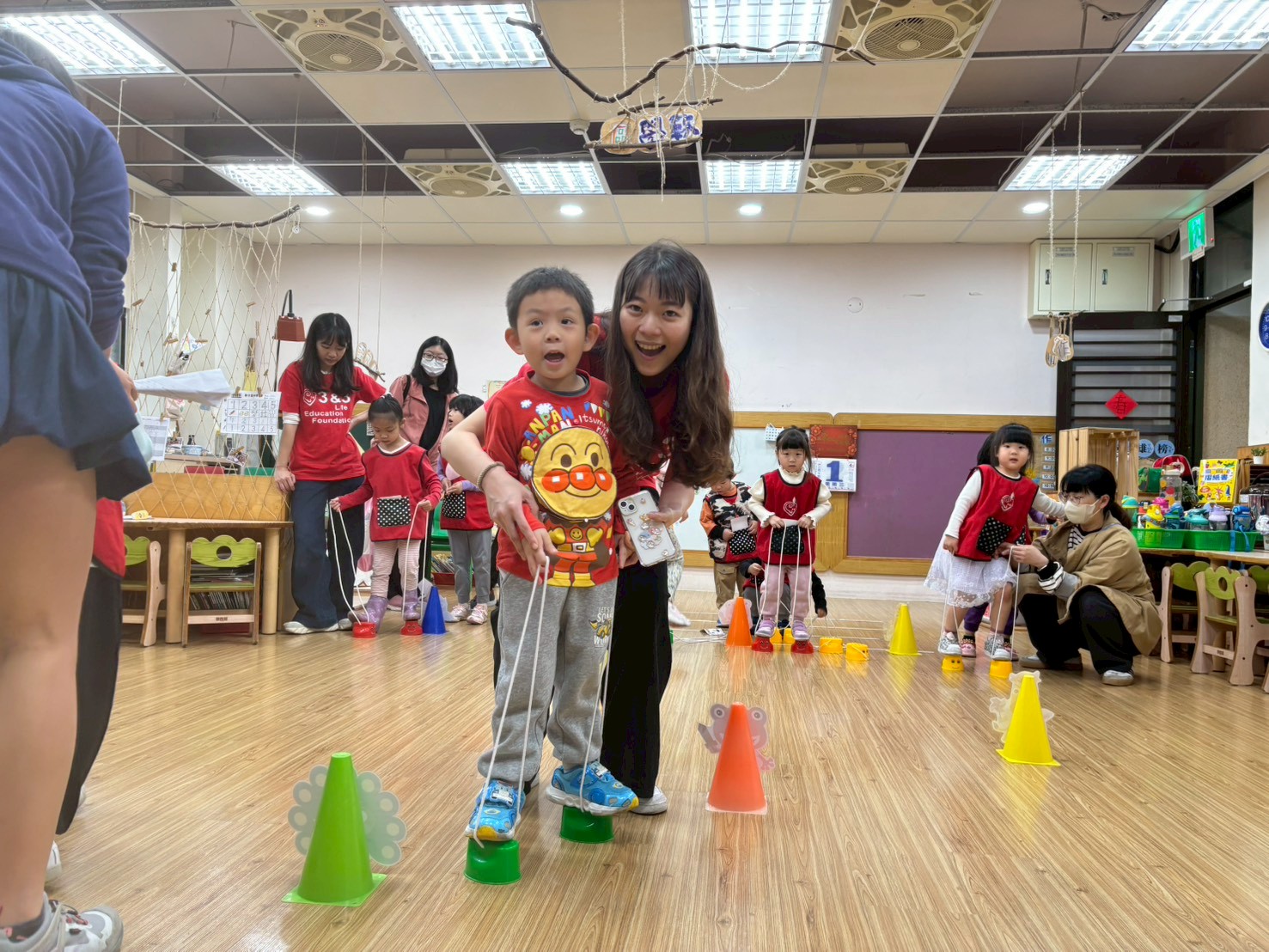 透過孩子的投票選出了五個有趣的遊戲-扭扭車、跳格子、摺紙飛機、套圈圈、踩高蹺,並將其製作成闖關關卡,陪伴孩子在放連家前一同闖關,寶貝們當日都玩得相當開心呢!
