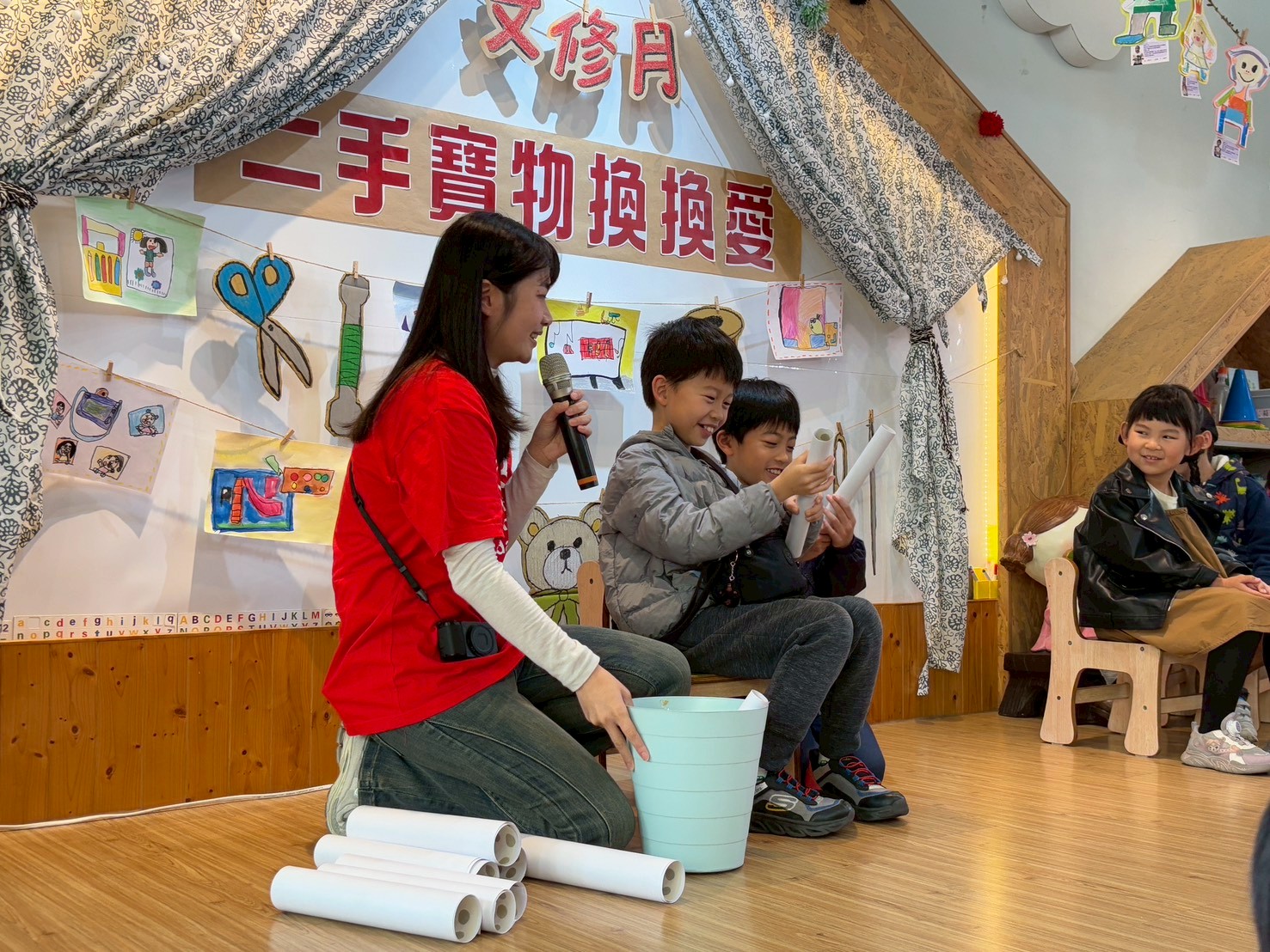 一年一度的文修月又來囉,這次邀請了畢業的學長姐來分享上小學的趣事,也回應了孩子們所好奇的問題;另外,舉辦了二手寶物換換愛的活動,邀請孩子帶了完善卻不需要的教玩具到校進行發票義賣,也透過此活動培養孩子珍惜物品的好習慣。愛>