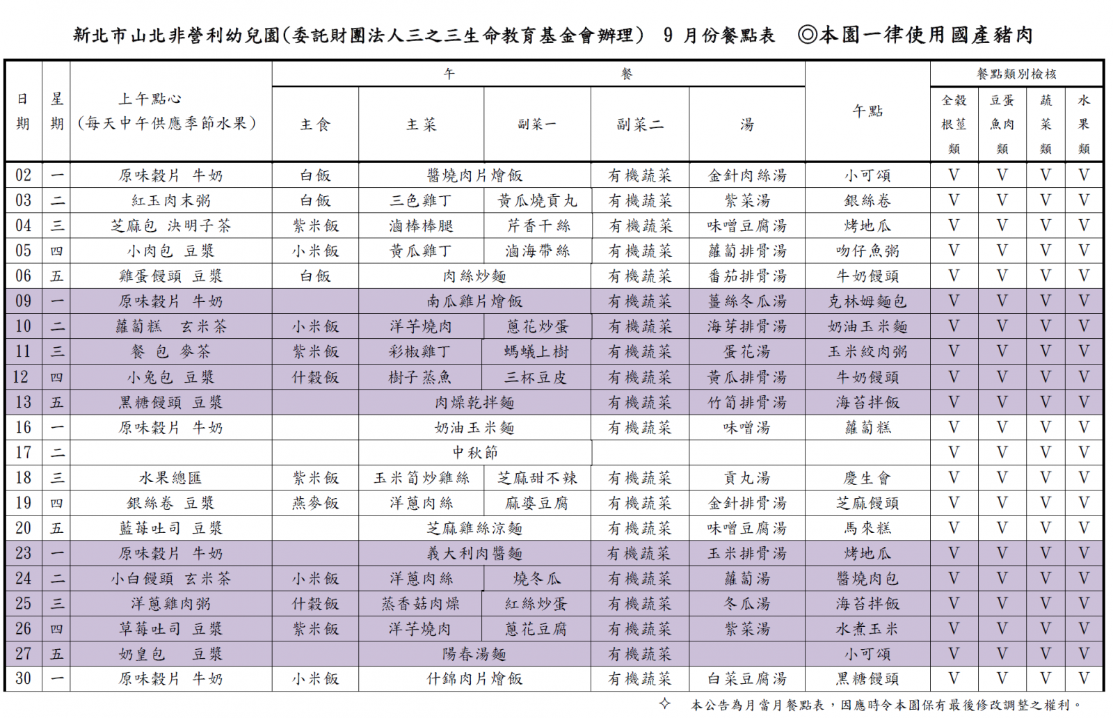113學年度第一學期 九月份菜單