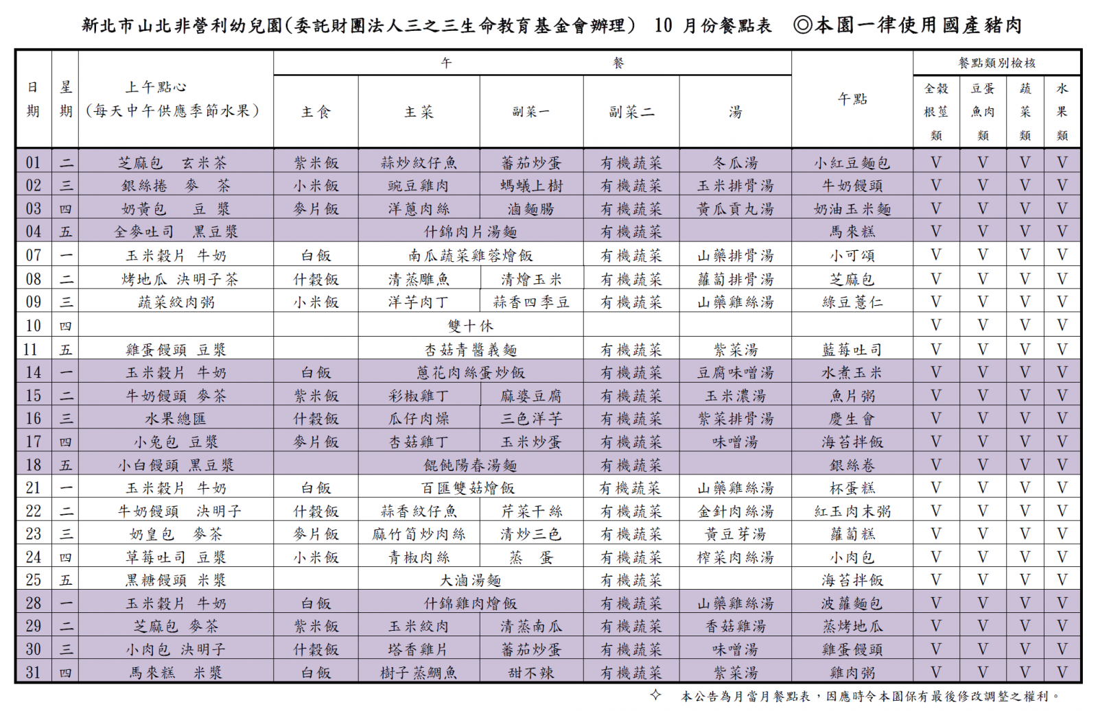 113學年度第一學期 十月份菜單