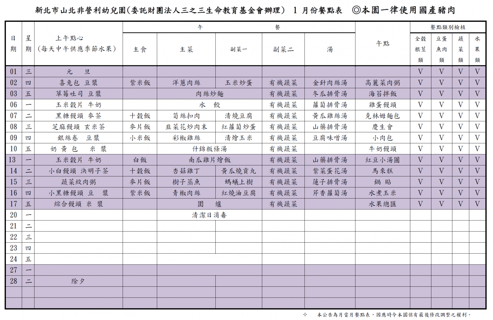 113學年度第一學期 一月份菜單