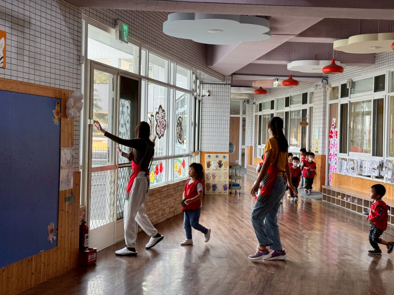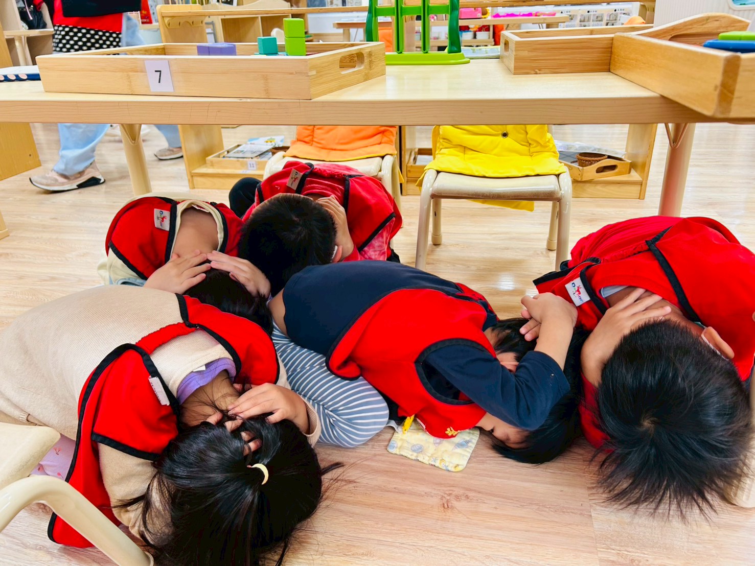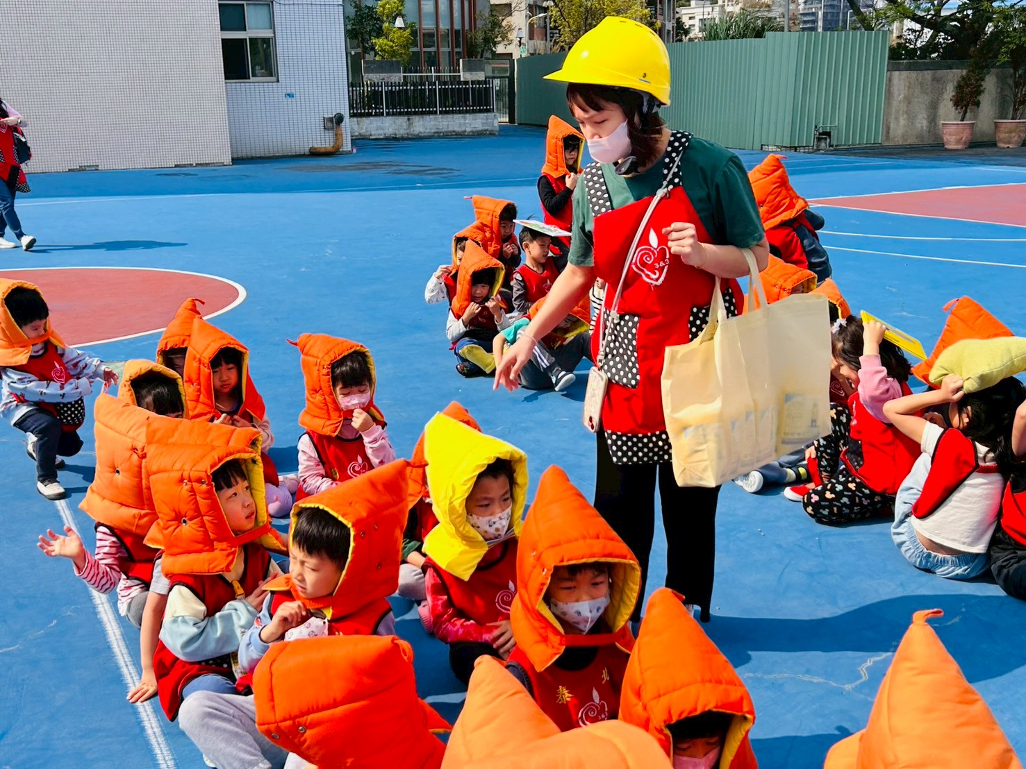 本次防震演練透過情境模擬進行,老師先向幼兒說明地震應變的重要性。警報響起時,孩子們迅速完成「趴下、掩護、穩住」,並在引導下戴上防災頭套,依序從安全出口撤離至集合地點。透過實際操作,提升幼兒防災意識與應變能力,也強化師生整體安全觀念。