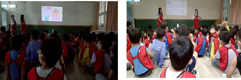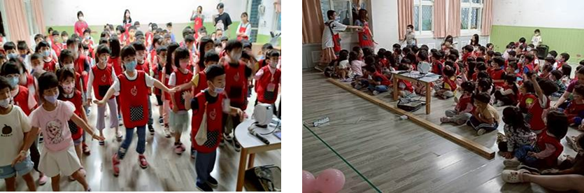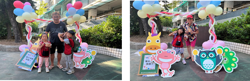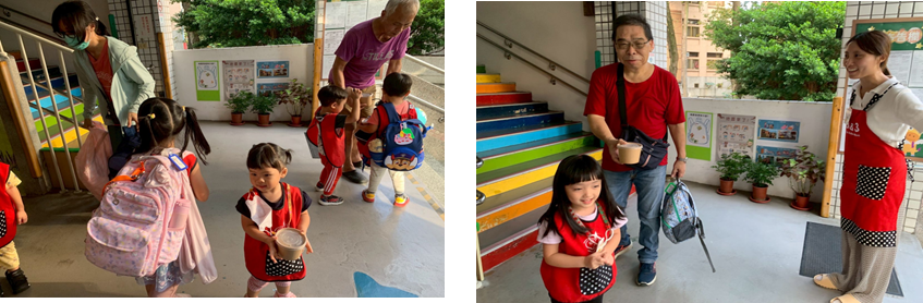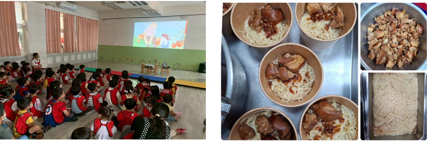 和小朋友們一起賞影片和「爺爺奶奶一起過一天」討論和爺爺奶奶相處的經驗、設置拍照牆拍照共享廚房阿姨製作的豬腳麵線