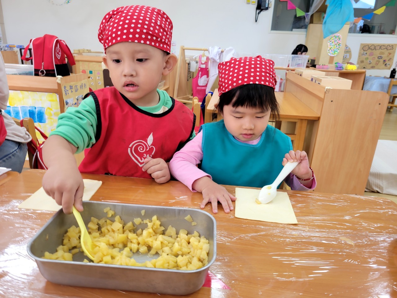 孩子們動手使用酥皮製作迷你可頌,學習麵團捲折技巧