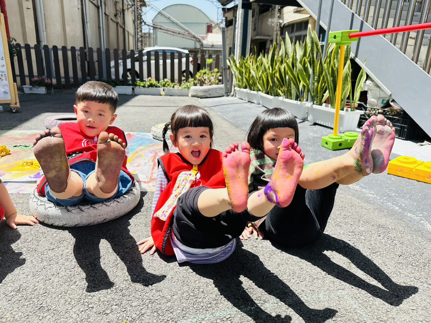 孩子們一邊唱著歌、一邊踩踏顏料,盡情揮灑內心的情緒,