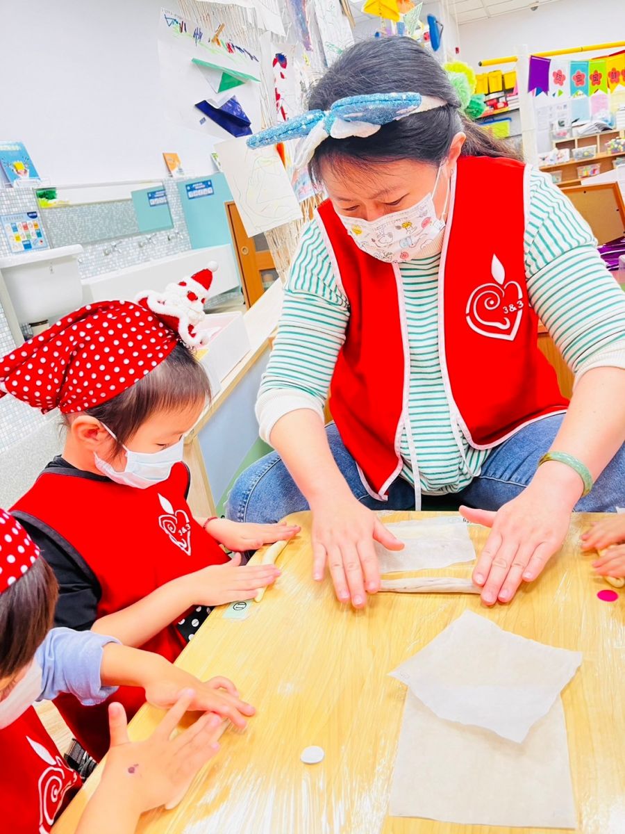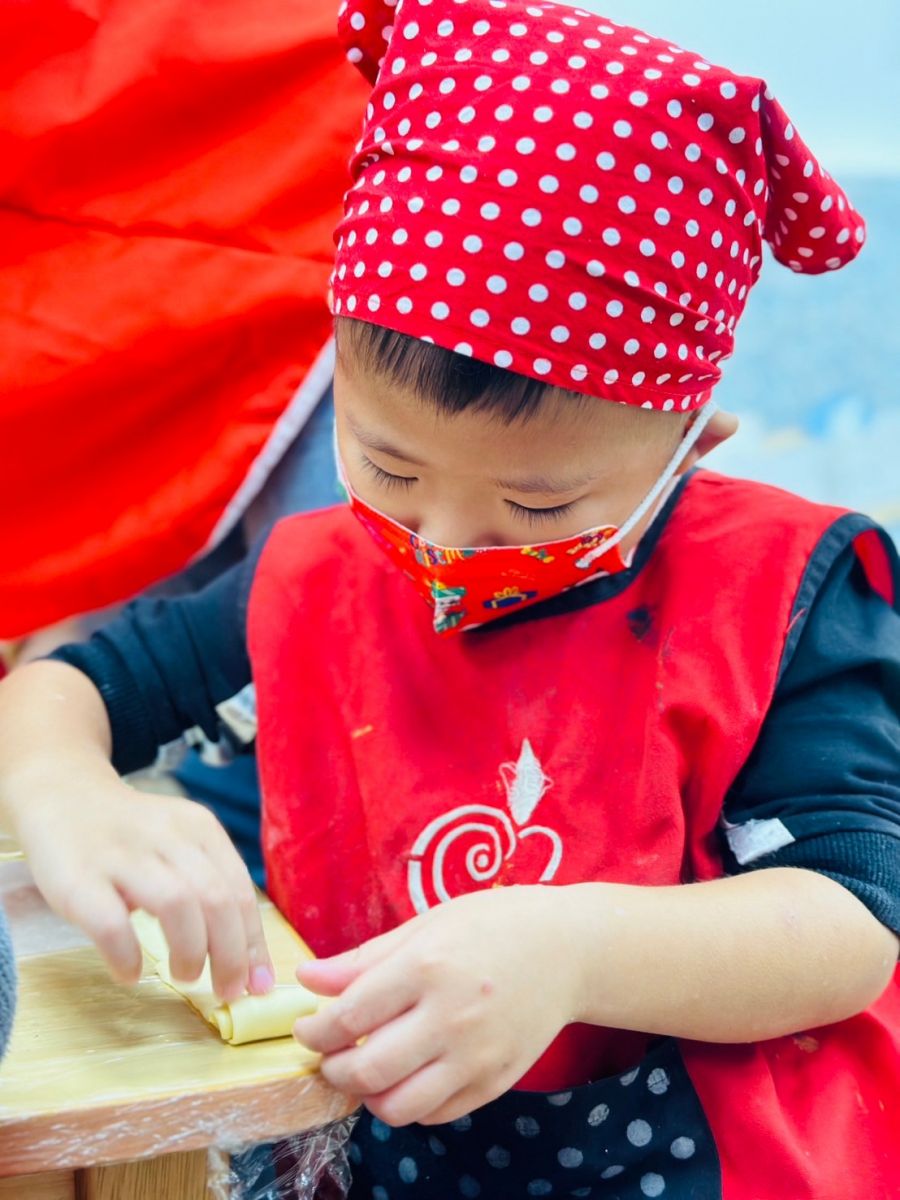 這次的蝸牛酥結合了幼兒以前的舊經驗,讓幼兒將餅皮切開並接長,材料放進餅皮後將材料包起來,
