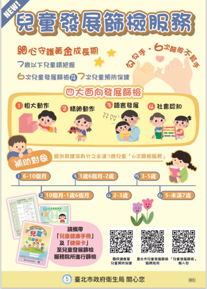 衛生福利部國民健康署參考美國疾病管制署及國內專家建議,建立兒童發展篩檢模式,自113年7月1日起,針對未滿7歲兒童新增6次兒童發展篩檢服務,以期及早發現發展遲緩兒童,及早療育,以提升兒童健康。