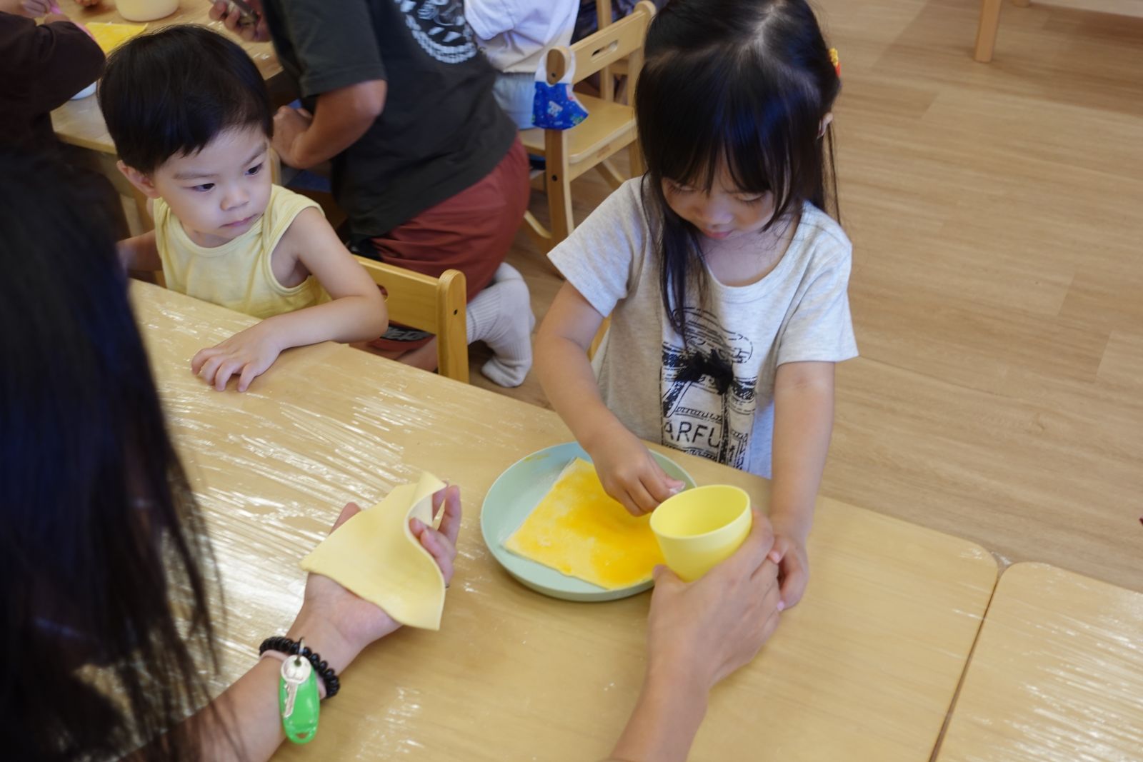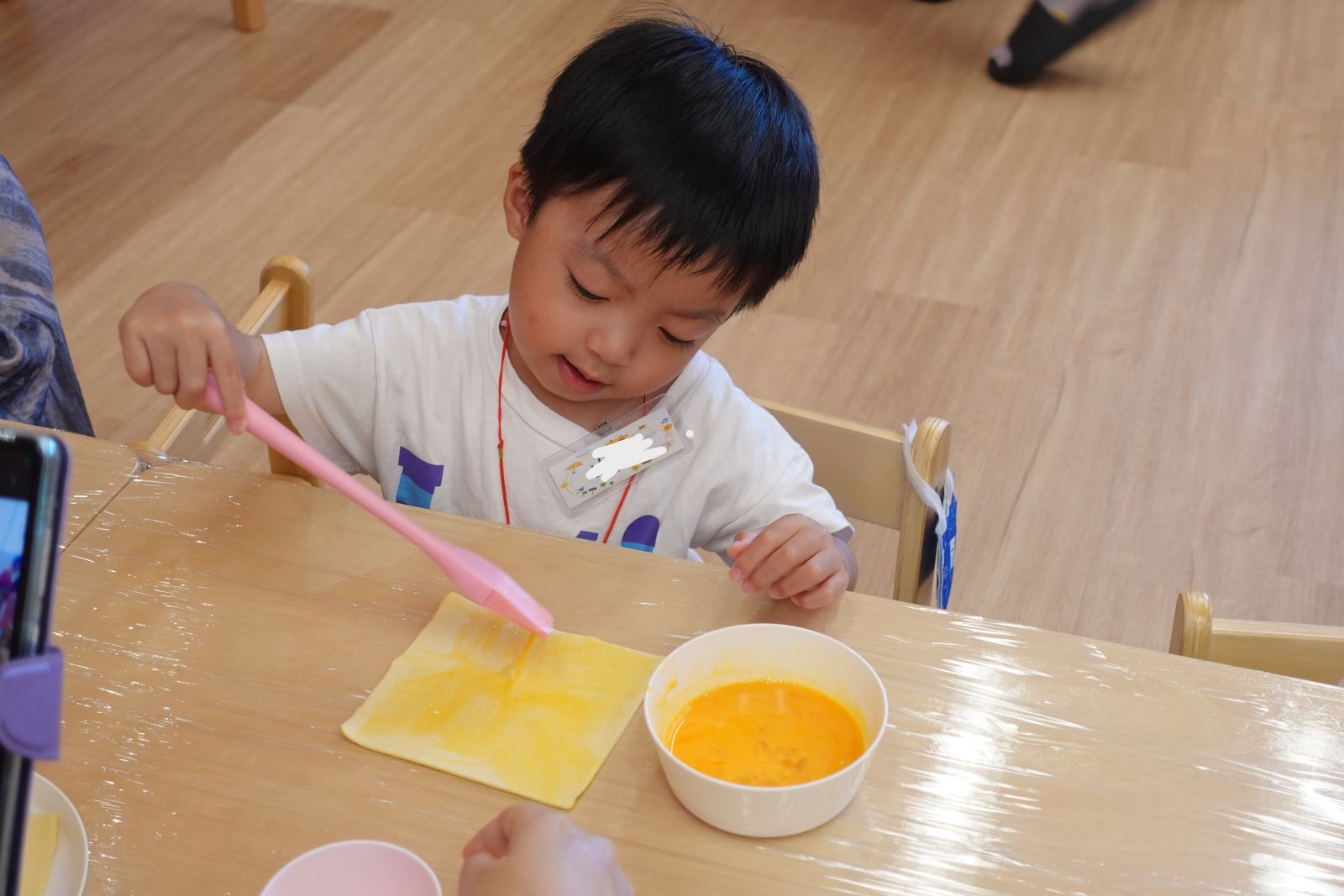 大小朋友們~這次老師準備了一整片~的酥皮來讓小朋友製作啦,先把蛋液抹一抹,幫酥皮穿上黃色的衣裳,接著再捲一捲、切一切,捲成愛心的形狀,放進烤箱。叮咚~美味酥脆的蝴蝶愛心餅乾就完成囉!