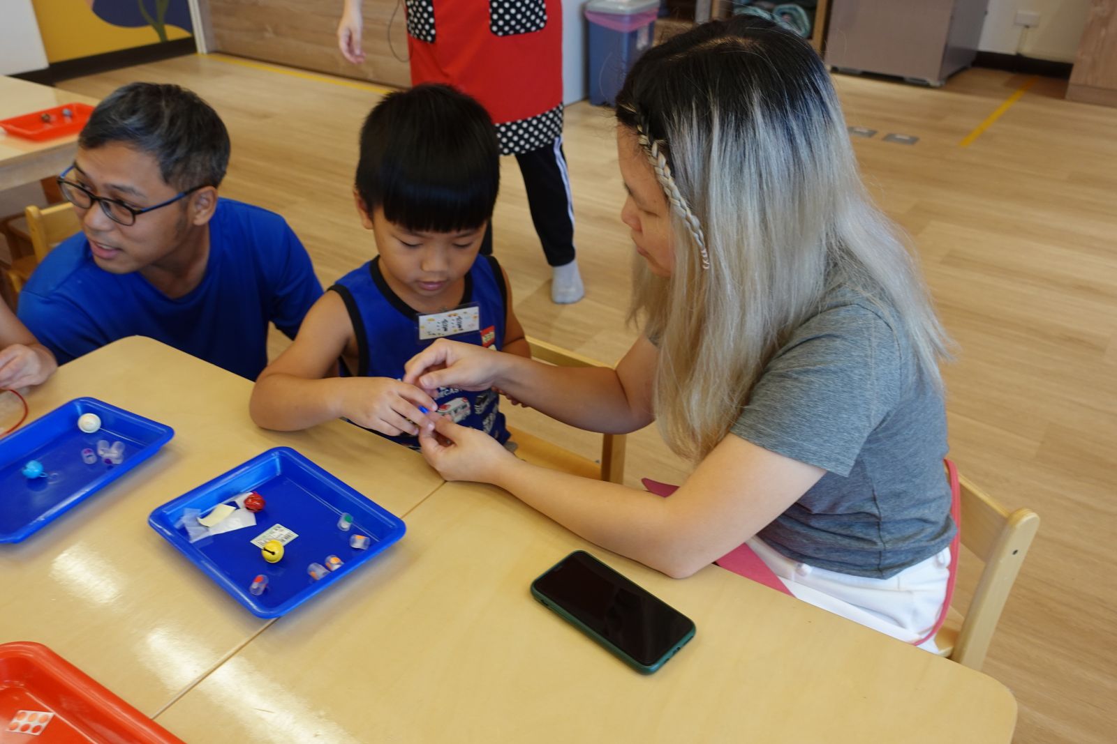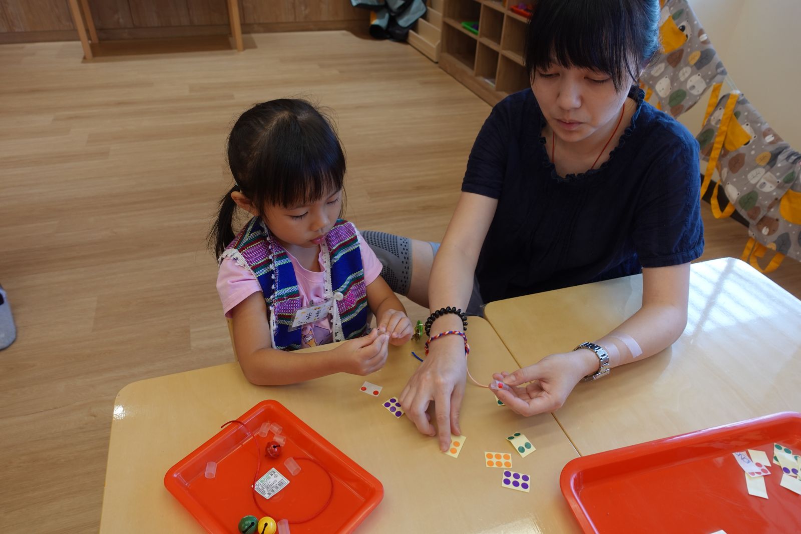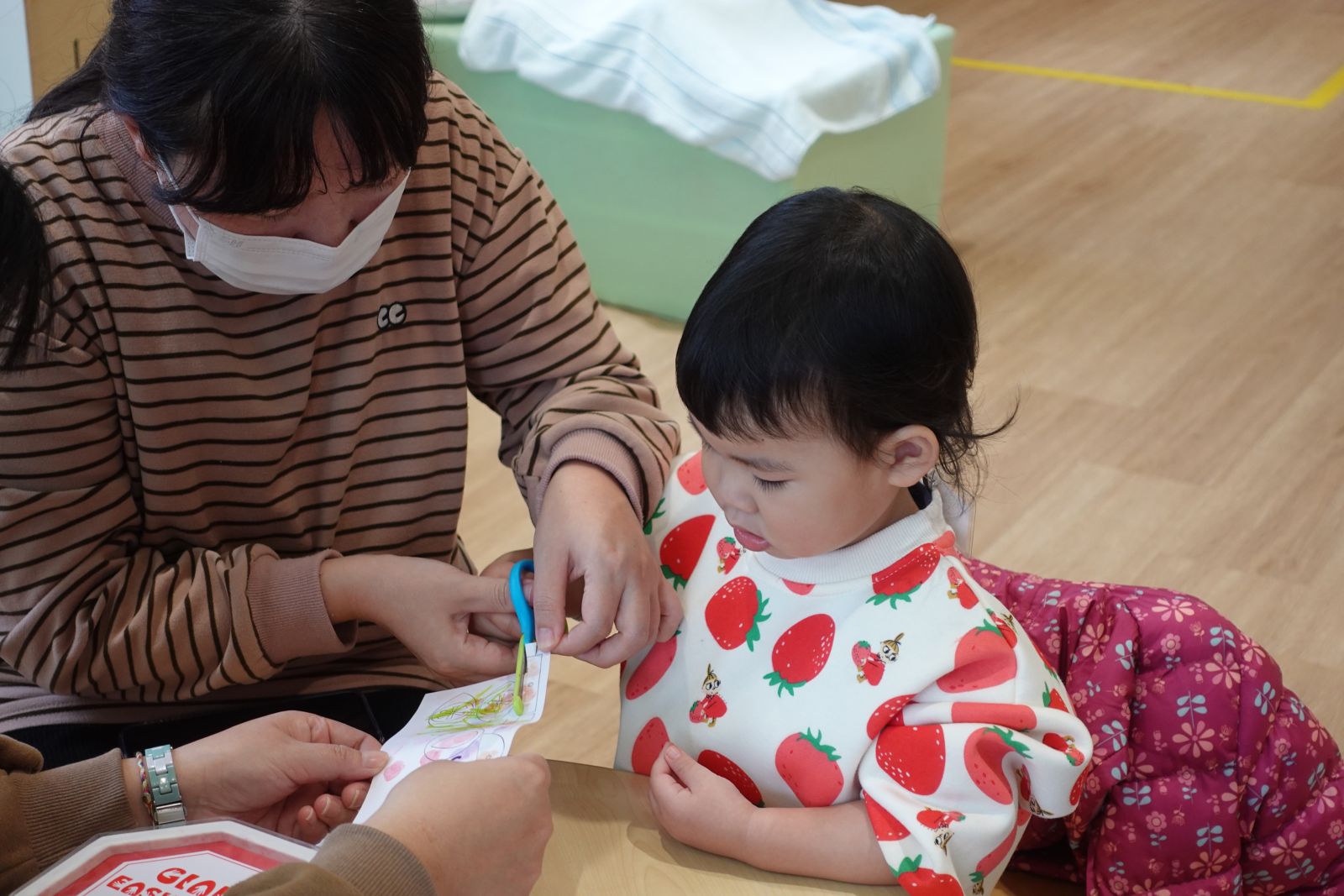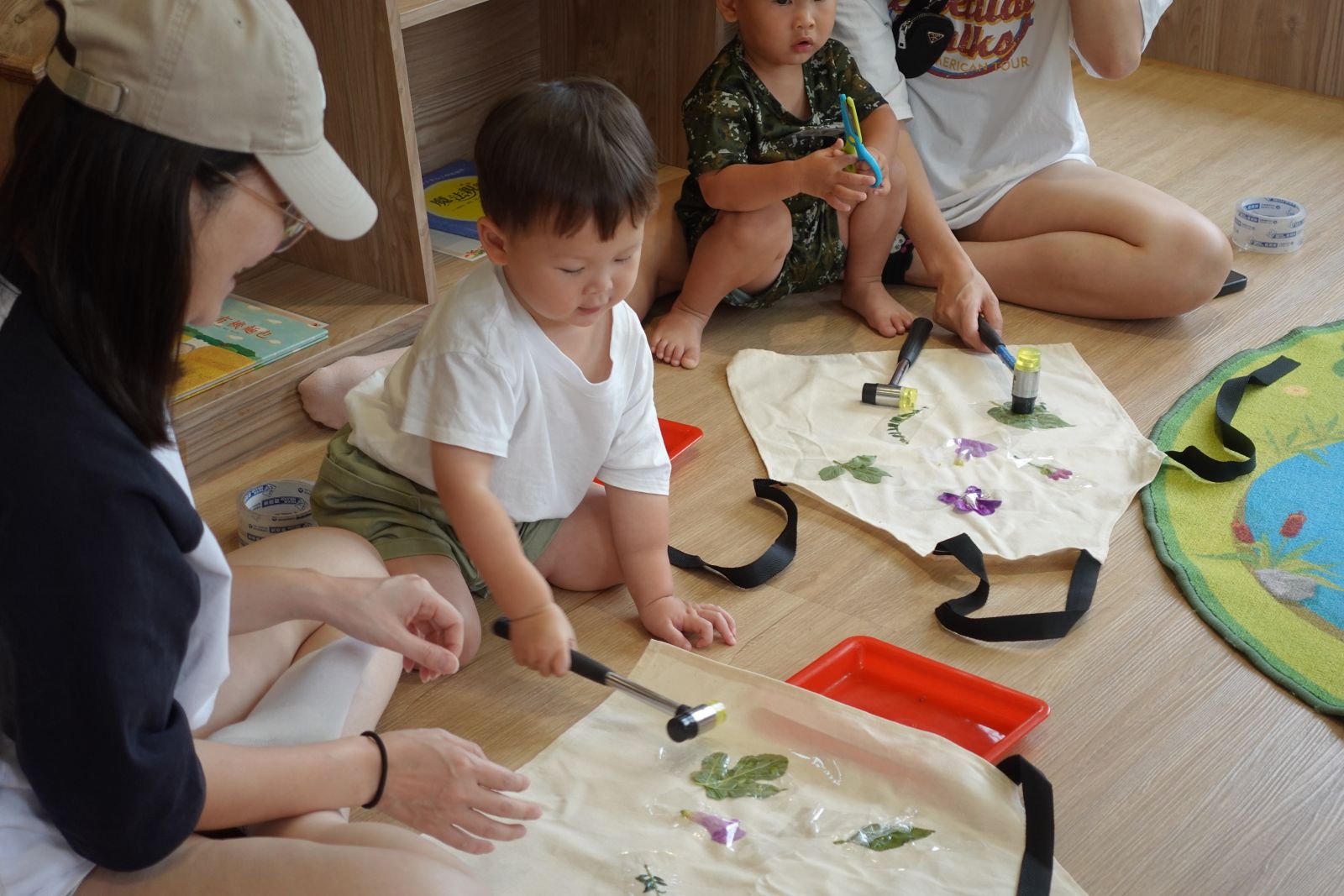 老師先和親子聊聊當小幫手的經驗,再一起幫忙貼上收玩具圖卡,原來幫忙做家事也可以這麼簡單!接著親子一起動手,將花草放在小幫手專屬圍裙上,然後使用橡膠槌敲一敲,做出專屬的植物拓印圍裙,穿上它,就能開心當個家事小幫手,回家一起幫忙做家事囉!