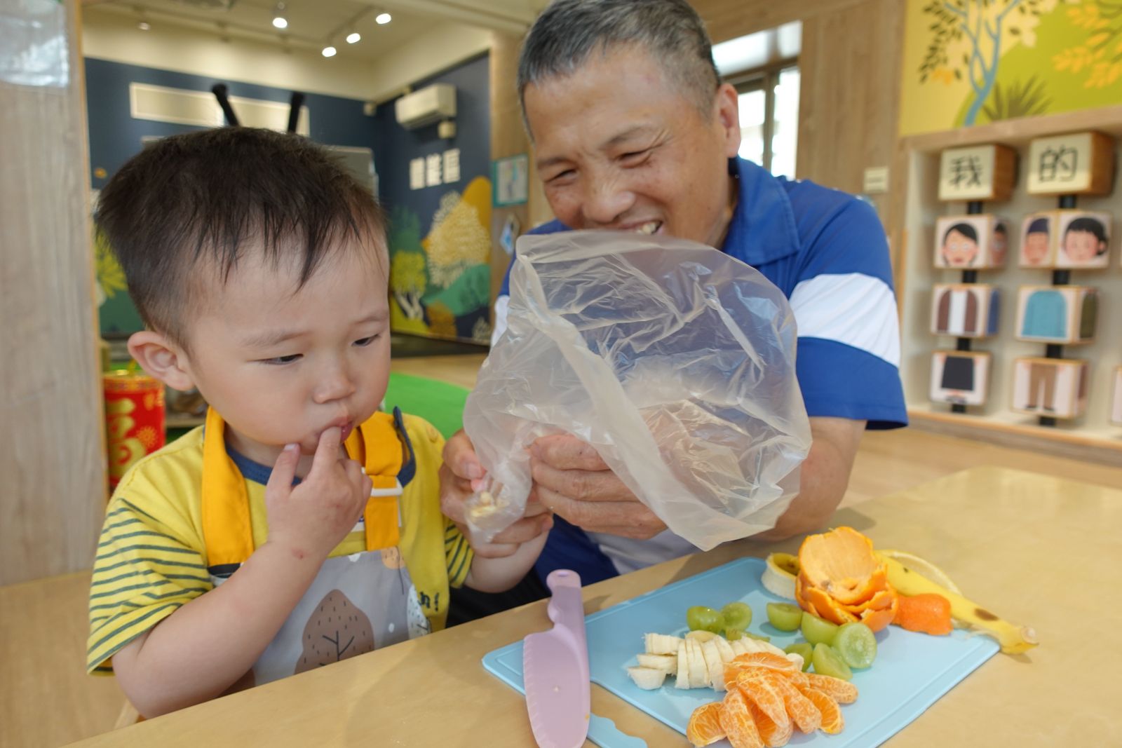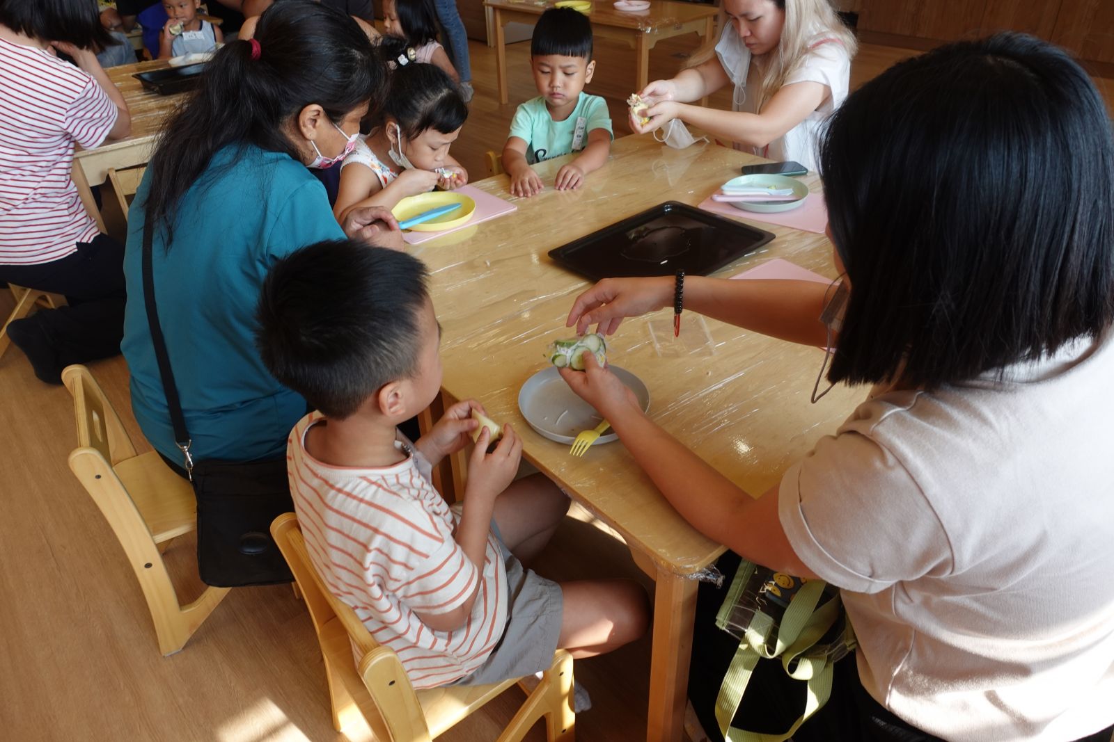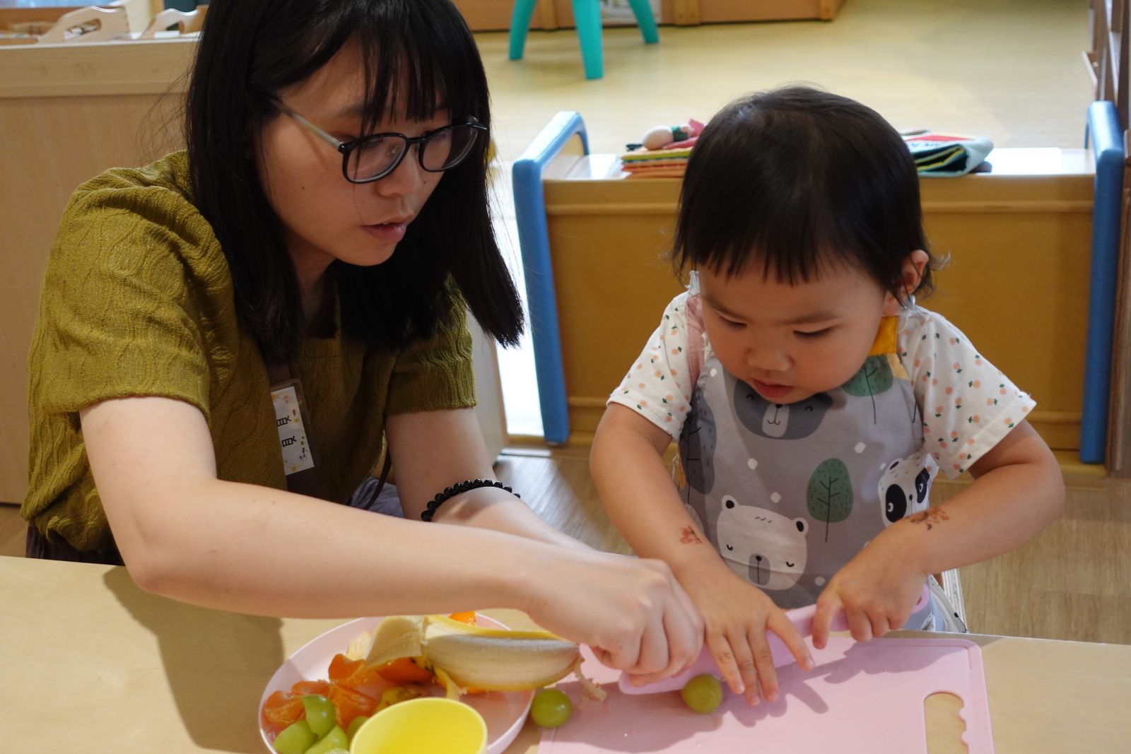 本月主題「寶貝家人」,上個月老師帶著親子介紹了各式各樣的房子,本月來認識房子裡面的人。各位大小朋友們都是和誰住在一起的呢?有的和舅舅或是姑姑、有的和爸爸媽媽、還有阿公阿嬤住在一起的,為了感謝這些陪伴我們、照顧我們的家人們,老師邀請大家一起製作健康的水果優格,把水果切一切、餅乾捏碎,最後再層層堆疊起來就完成~回家後可以和家人一起吃喔!