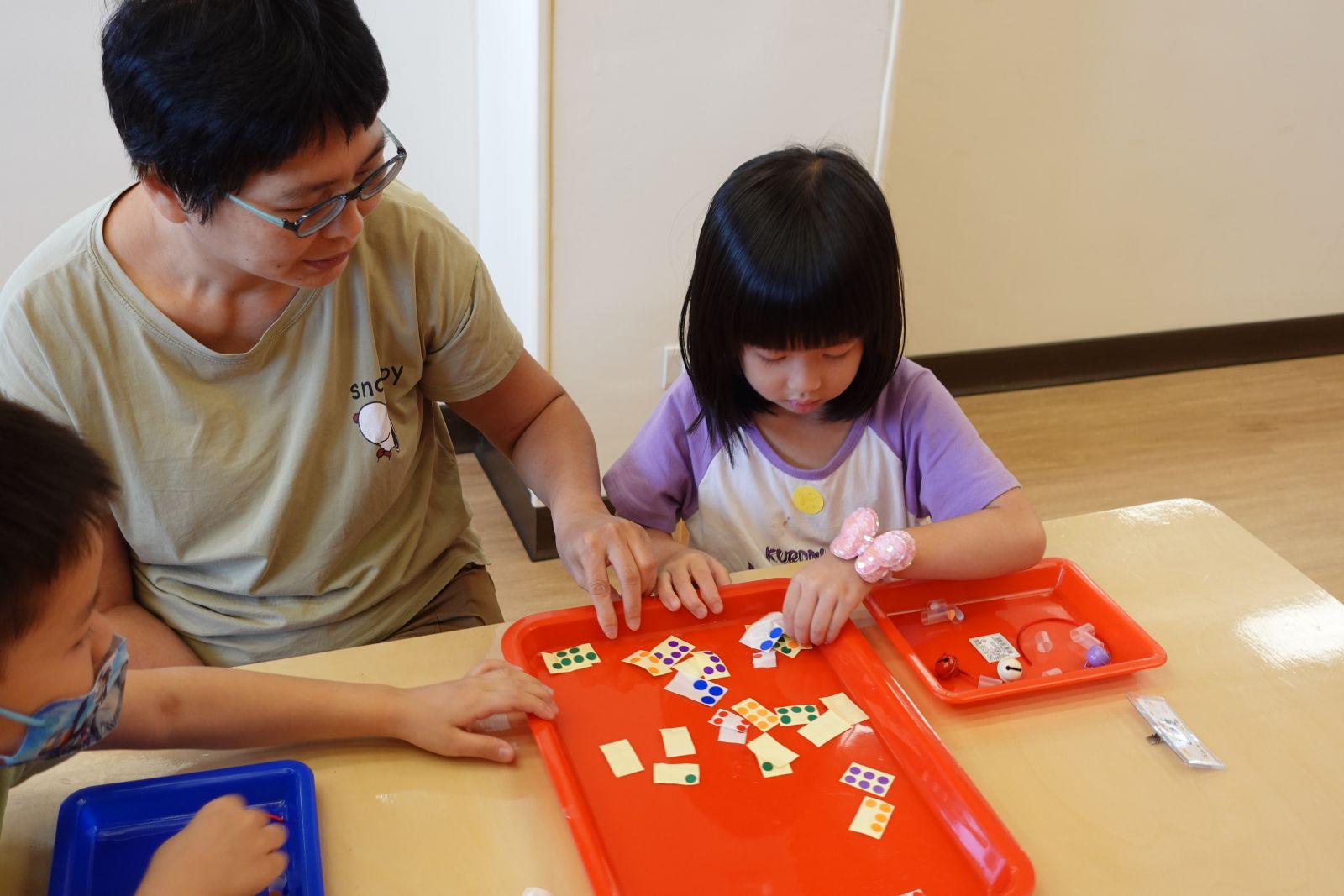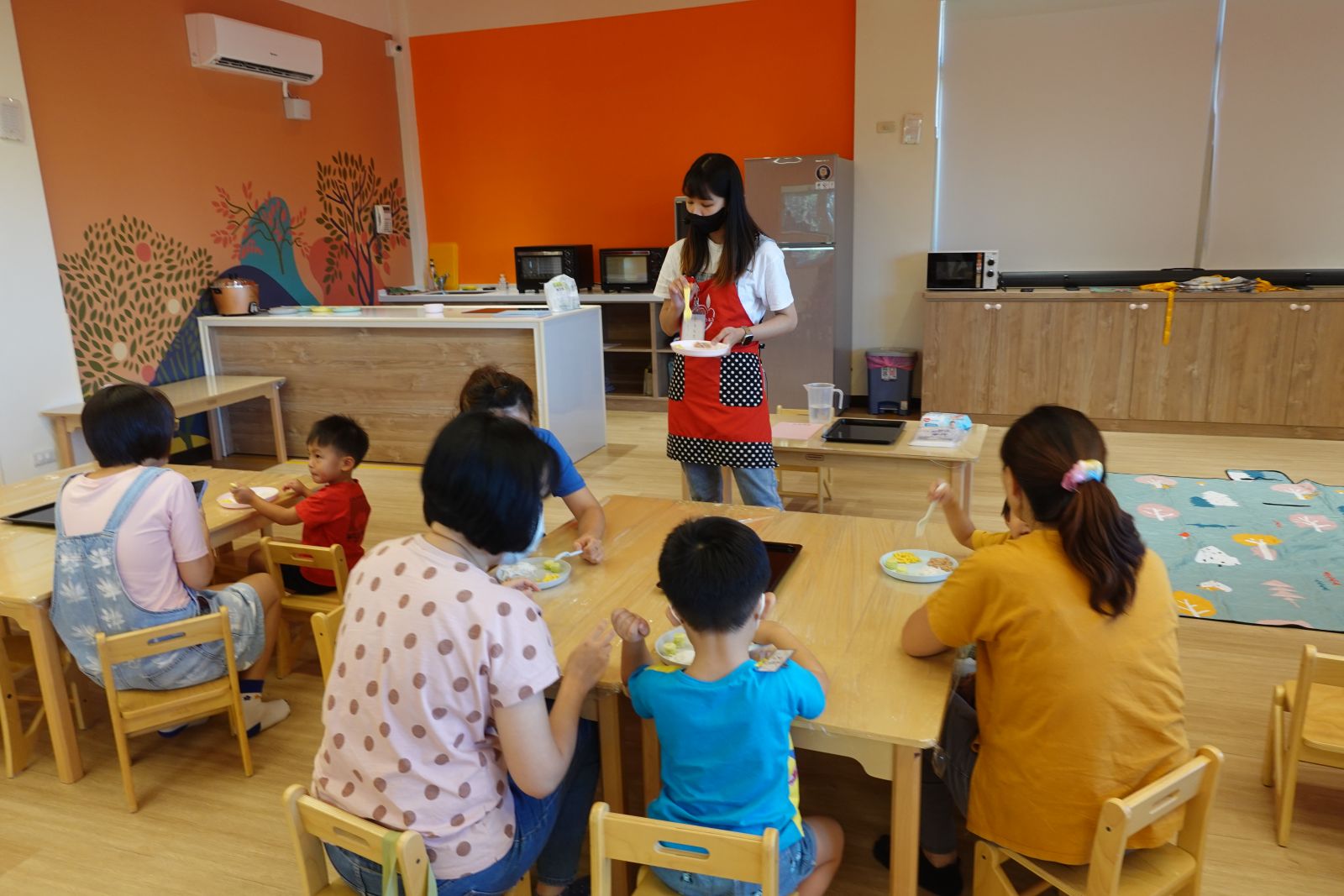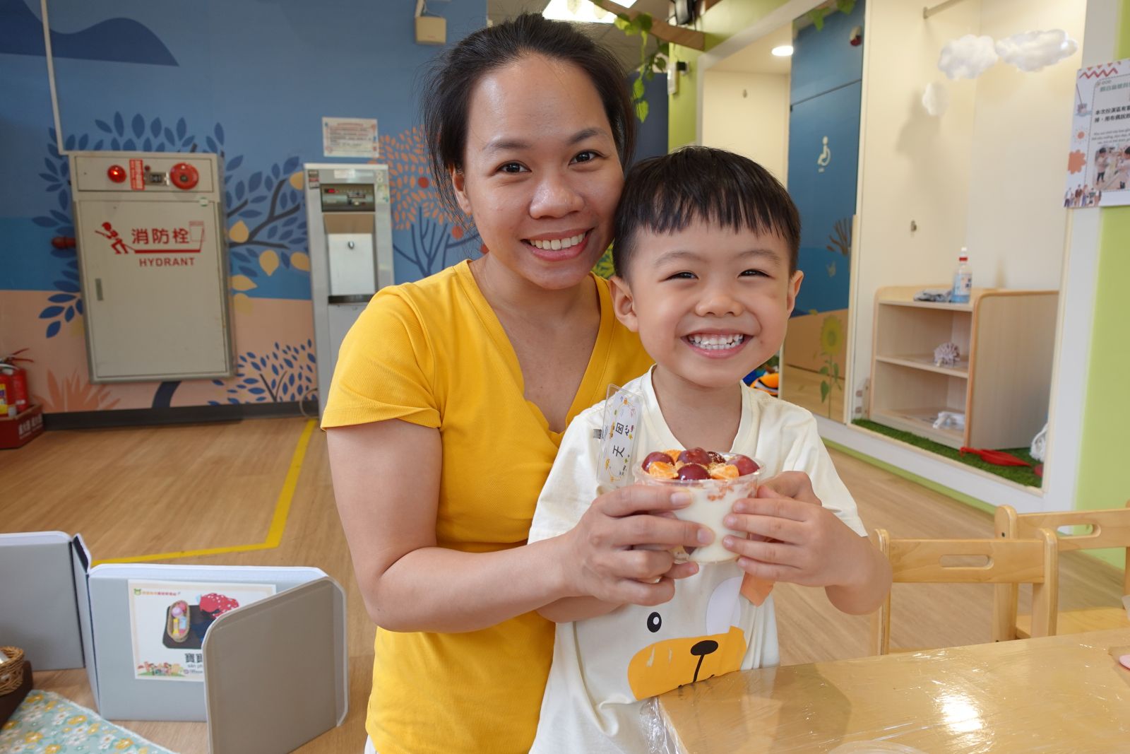 本月主題「寶貝家人」,上個月老師帶著親子介紹了各式各樣的房子,本月來認識房子裡面的人。各位大小朋友們都是和誰住在一起的呢?有的和舅舅或是姑姑、有的和爸爸媽媽、還有阿公阿嬤住在一起的,為了感謝這些陪伴我們、照顧我們的家人們,老師邀請大家一起製作健康的水果優格,把水果切一切、餅乾捏碎,最後再層層堆疊起來就完成~回家後可以和家人一起吃喔!