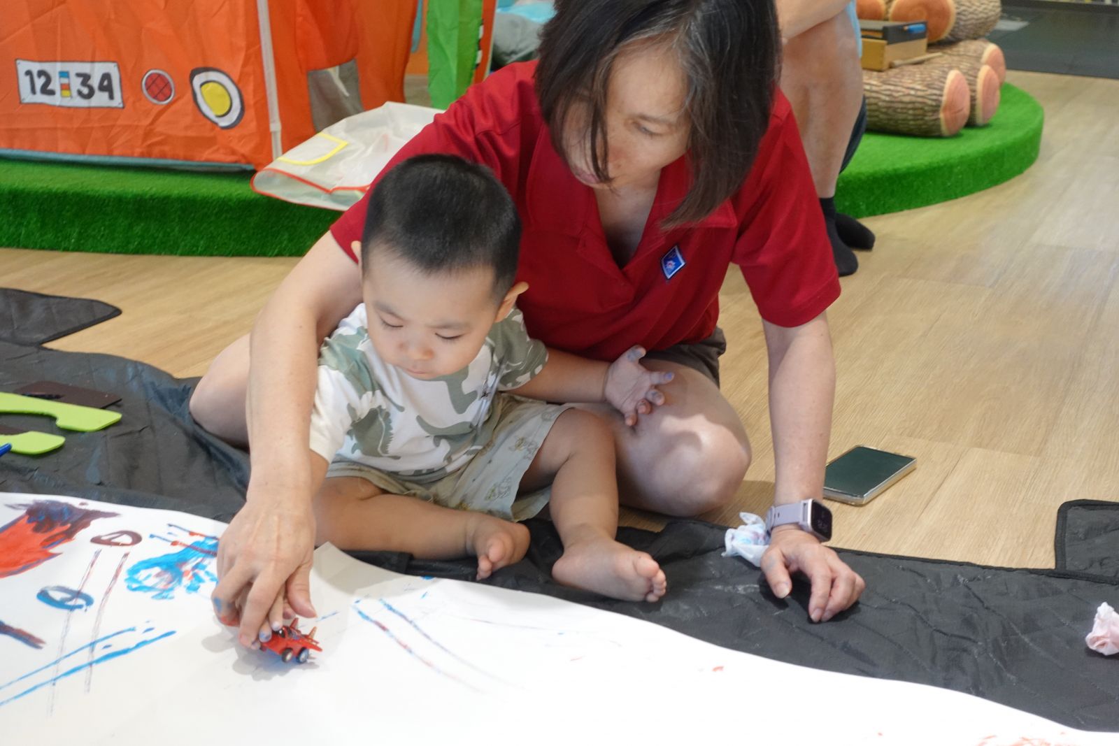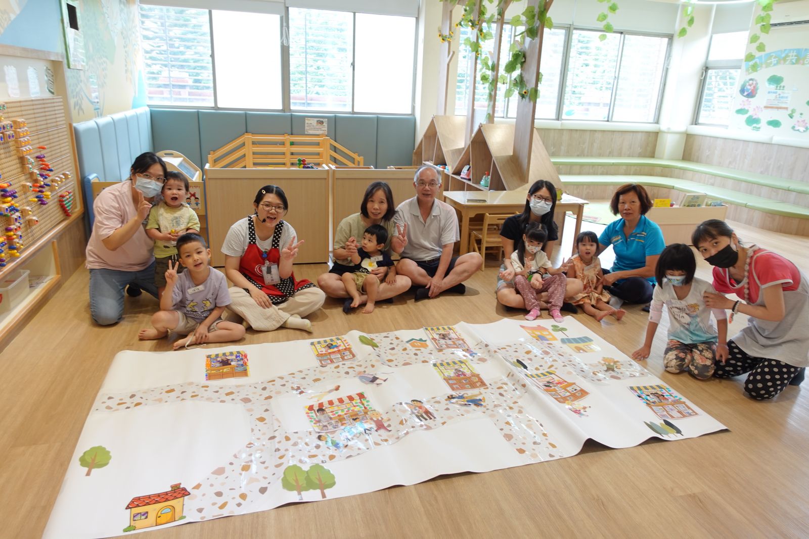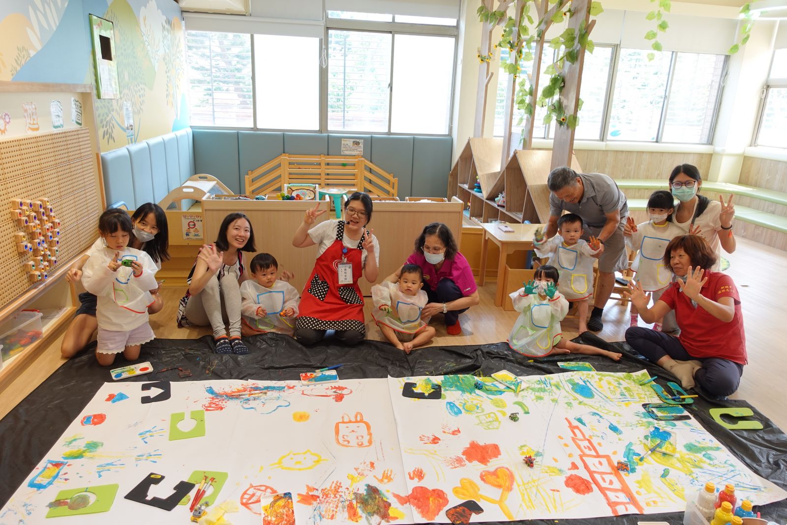 老師帶著親子用手指謠認識新坡社區的地標。接著親子一起用顏料「畫我們的社區」,有的親子畫高樓,還幫每層樓上色,也有的人畫出彩色的樹、星星。最後老師請幼兒選擇一輛玩具車,並將玩具車沾上顏料在紙上滑行,創造出繽紛馬路,一起完成充滿創意又溫馨的社區!