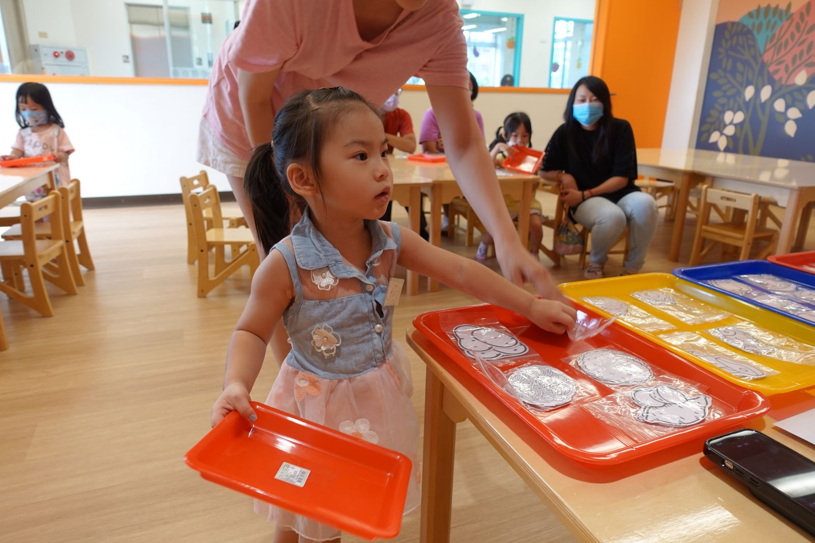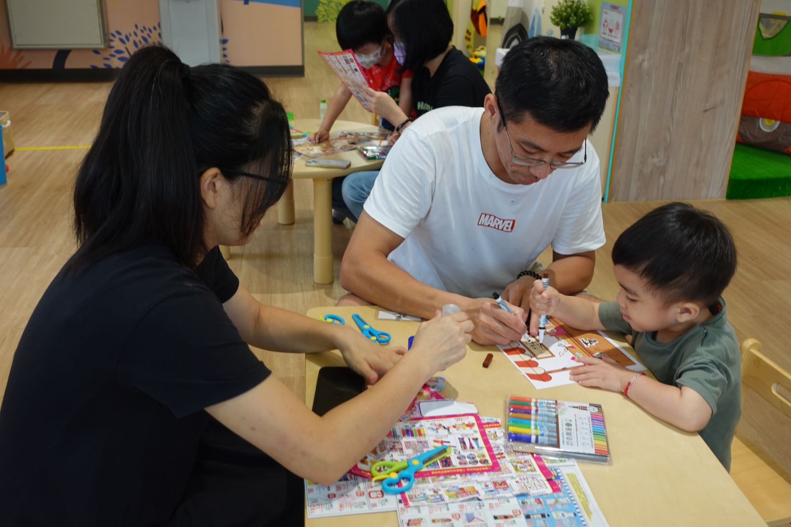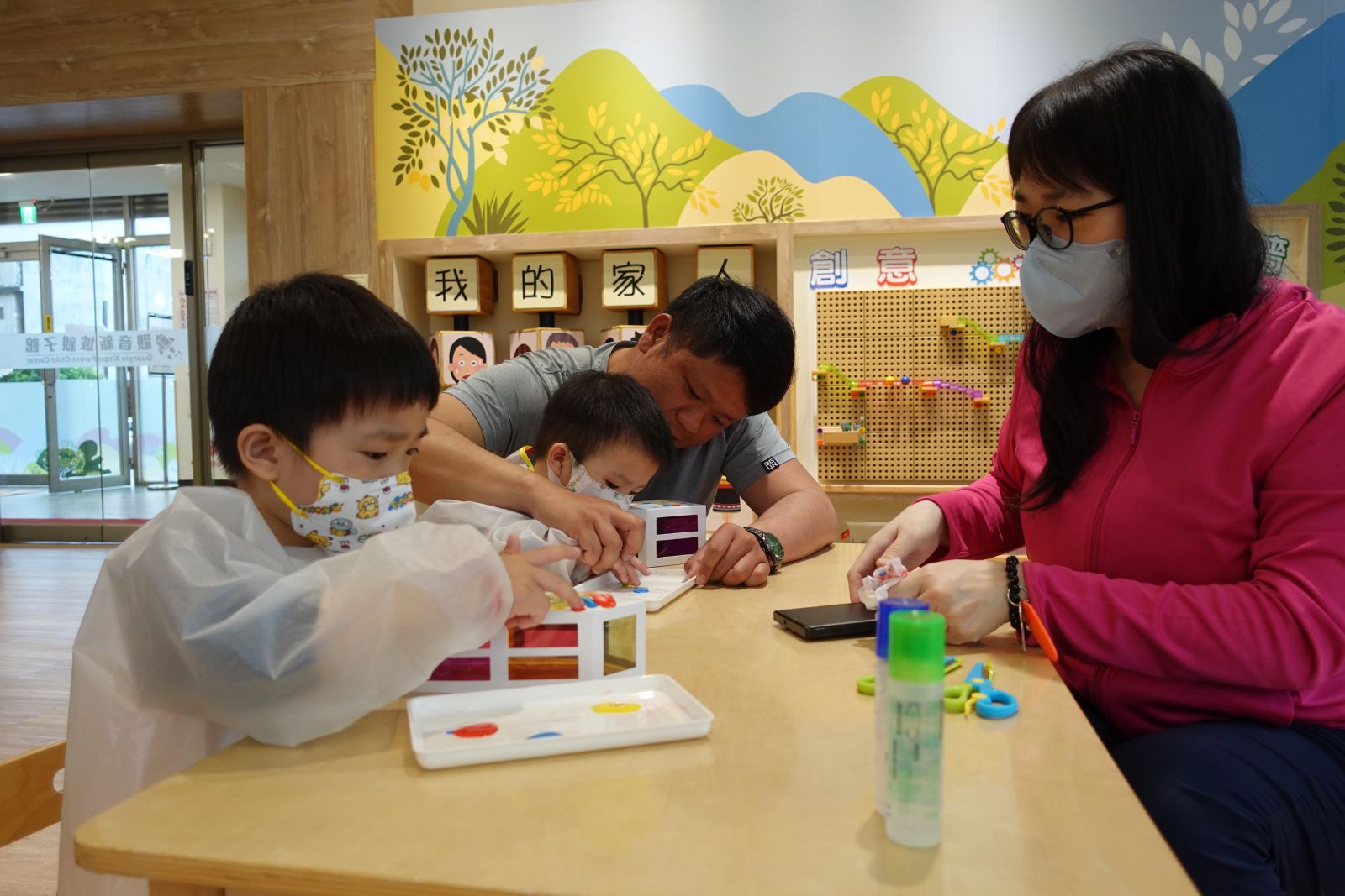 老師帶著親子用手指謠認識新坡社區的地標。接著親子一起用顏料「畫我們的社區」,有的親子畫高樓,還幫每層樓上色,也有的人畫出彩色的樹、星星。最後老師請幼兒選擇一輛玩具車,並將玩具車沾上顏料在紙上滑行,創造出繽紛馬路,一起完成充滿創意又溫馨的社區!