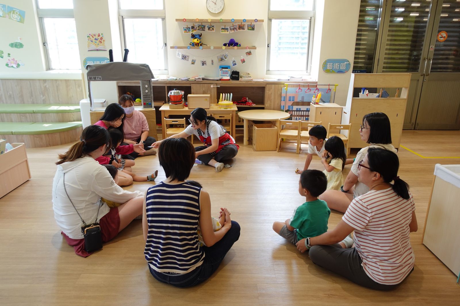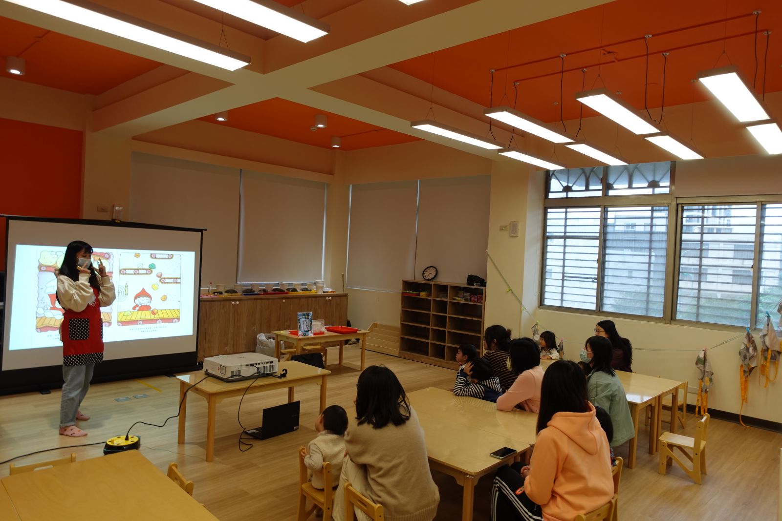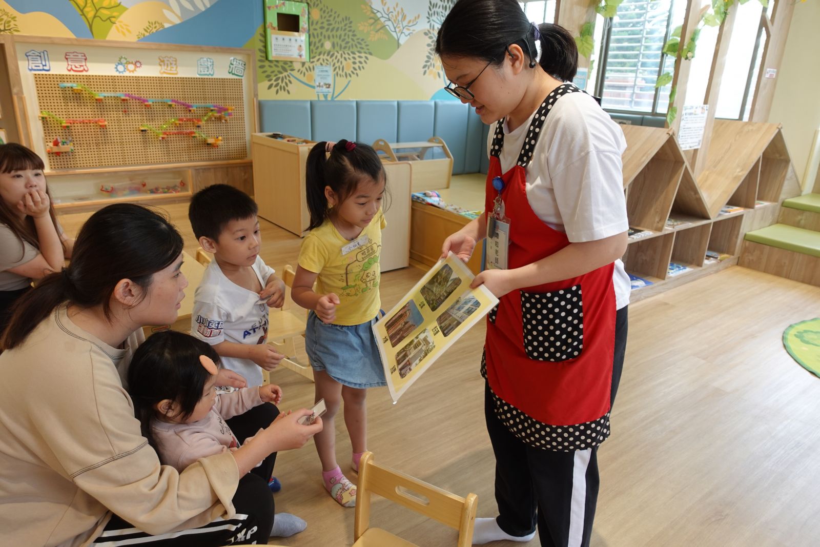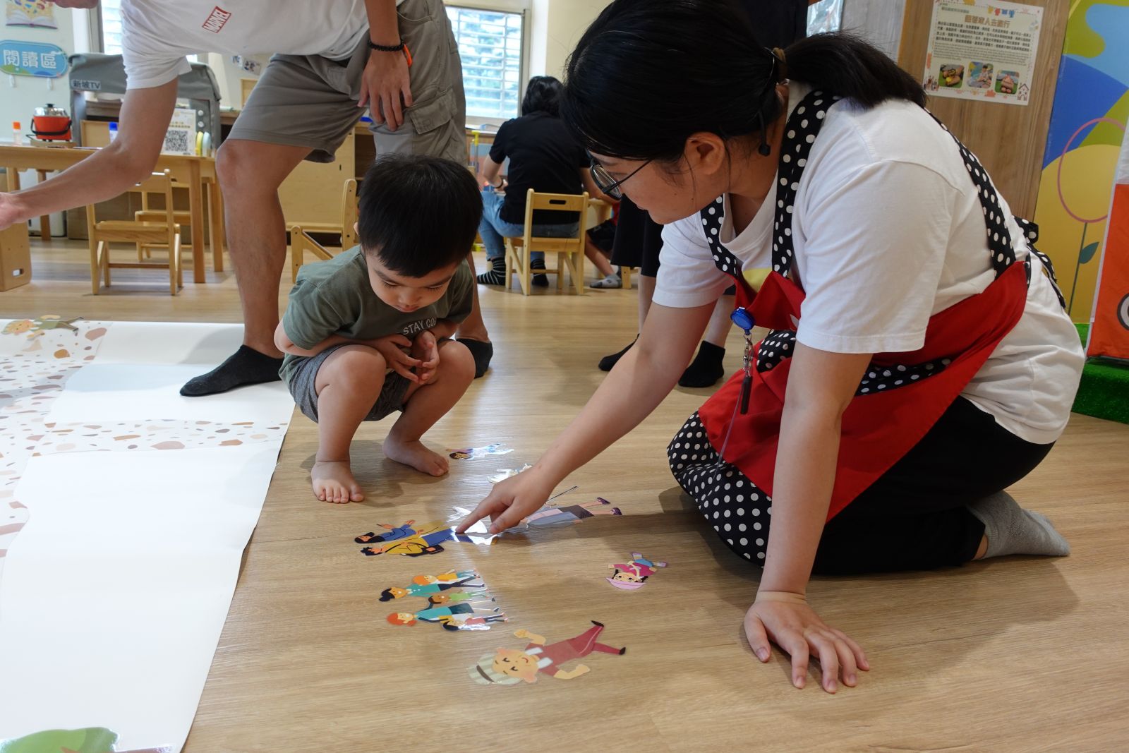 親子們跟著《小蘋果的鄰居》故事,一起體驗熱鬧的跳蚤市場!每組親子設計自己的小攤位,先拍照剪下小頭像貼上攤位當老闆,再畫出想賣的商品,有的選了水果、有的選了玩具,還幫攤位繽紛上色、取了可愛的店名。最後大家把完成的攤位放到社區地圖上,邀請「鄰居」們一起逛攤、分享和交流。親子們玩得開心又學會合作,老師還會將攤位作品展示在舞台區牆面上,讓大家一同欣賞精彩成果!